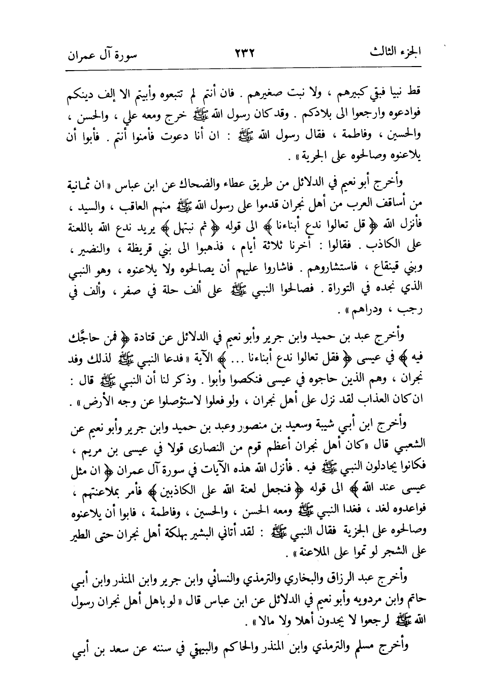 وَأخرج عبد الرَّزَّاق وَالْبُخَارِيّ وَالتِّرْمِذِيّ وَالنَّسَائِيّ وَابْن جرير وَابْن الْمُنْذر وَابْن أبي حَاتِم وَابْن مرْدَوَيْه وَأَبُو نعيم فِي الدَّلَائِل عَن ابْن عَبَّاس قَالَ لَو بَاهل أهل نَجْرَان رَسُول الله صلى الله عَلَيْهِ وَسلم لرجعوا لَا يَجدونَ أَهلا وَلَا مَالا