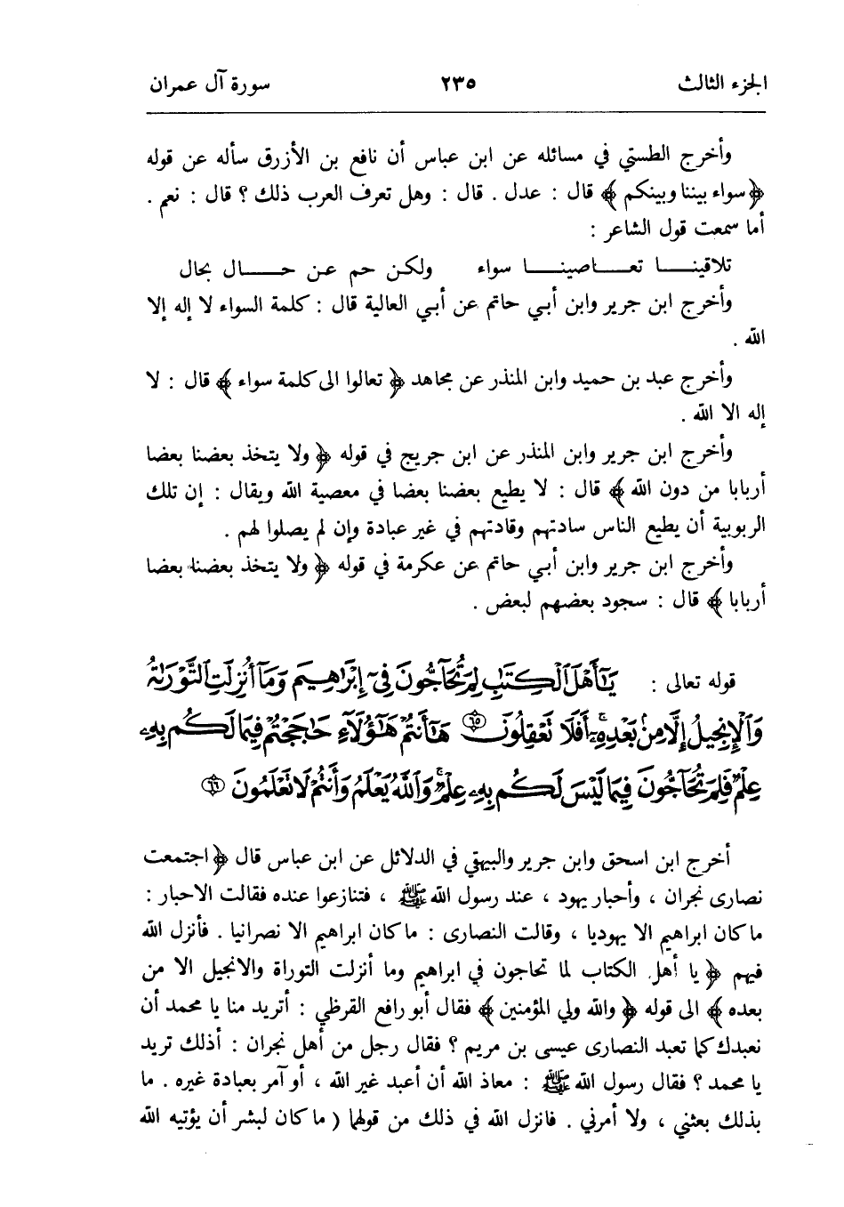 أخرج ابْن إِسْحَق وَابْن جرير وَالْبَيْهَقِيّ فِي الدَّلَائِل عَن ابْن عَبَّاس قَالَ اجْتمعت نَصَارَى نَجْرَان وأحبار يهود عِنْد رَسُول الله صلى الله عَلَيْهِ وَسلم فتنازعوا عِنْده فَقَالَت الْأَحْبَار: مَا كَانَ إِبْرَاهِيم إِلَّا يَهُودِيّا وَقَالَت النَّصَارَى: مَا كَانَ إِبْرَاهِيم إِلَّا نَصْرَانِيّا