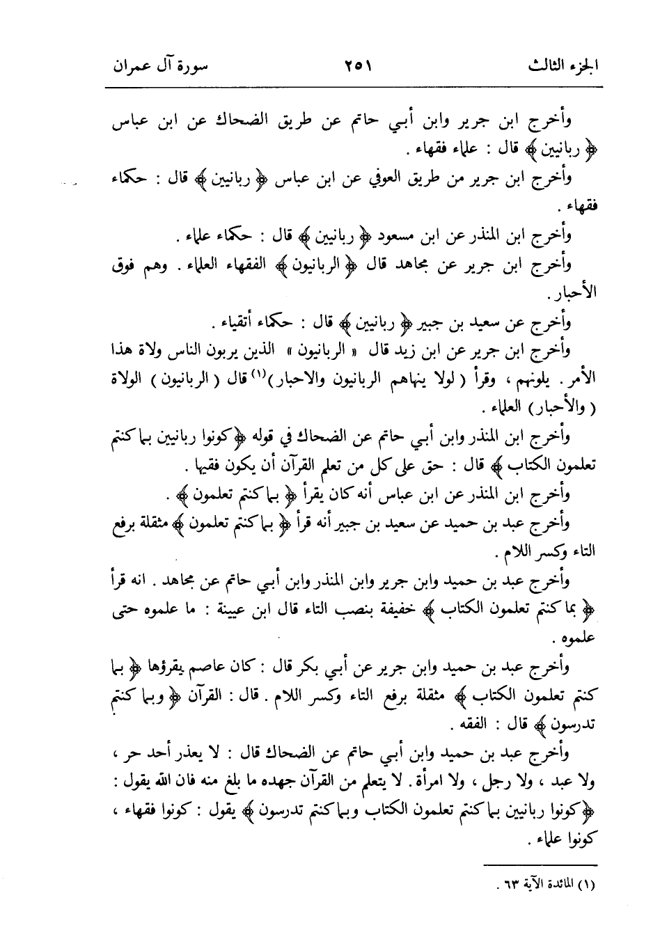 وَأخرج ابْن جرير وَابْن أبي حَاتِم عَن طَرِيق الضَّحَّاك عَن ابْن عَبَّاس {ربانيين} قَالَ: عُلَمَاء فُقَهَاء