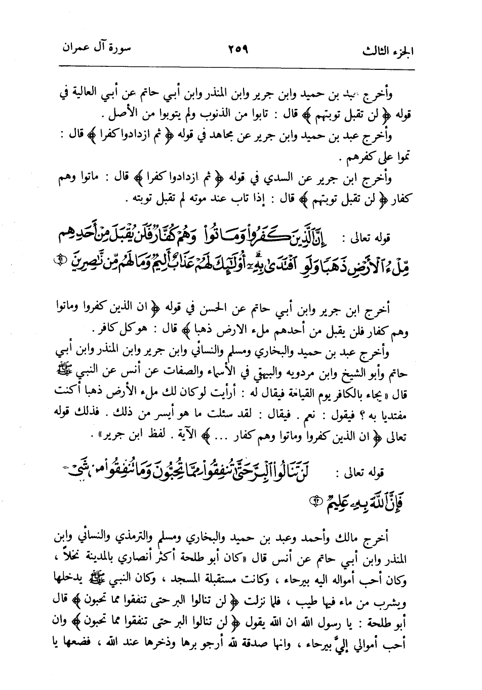 أخرج مَالك وَأحمد وَعبد بن حميد وَالْبُخَارِيّ وَمُسلم وَالتِّرْمِذِيّ وَالنَّسَائِيّ وَابْن الْمُنْذر وَابْن أبي حَاتِم عَن أنس قَالَ: كَانَ أَبُو طَلْحَة أَكثر أَنْصَارِي بِالْمَدِينَةِ نخلا وَكَانَ أحب أَمْوَاله إِلَيْهِ بيرحاء وَكَانَت مُسْتَقْبلَة الْمَسْجِد وَكَانَ النَّبِي صلى الله عَلَيْهِ وَسلم يدخلهَا وَيشْرب من مَاء فِيهَا طيب فَلَمَّا نزلت {لن تنالوا الْبر حَتَّى تنفقوا مِمَّا تحبون} قَالَ أَبُو طَلْحَة: يَا رَسُول الله إِن الله يَقُول {لن تنالوا الْبر حَتَّى تنفقوا مِمَّا تحبون} وان أحب أَمْوَالِي إليَّ بيرحاء وَإِنَّهَا صَدَقَة لله أَرْجُو برهَا وَذُخْرهَا عِنْد الله فضعها يَا