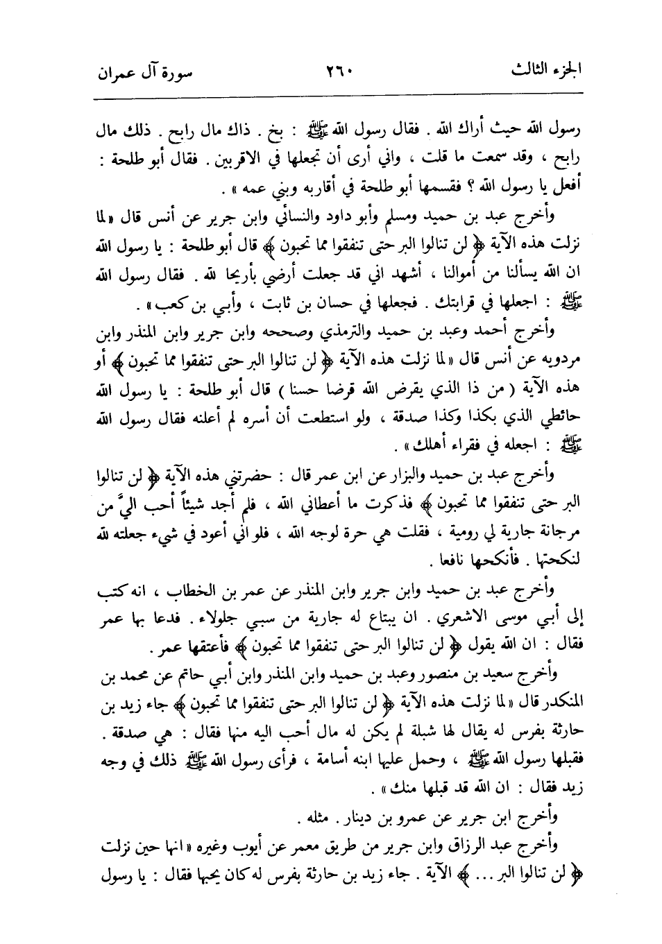 وَأخرج عبد بن حميد وَمُسلم وَأَبُو دَاوُد وَالنَّسَائِيّ وَابْن جرير عَن أنس قَالَ: لما نزلت هَذِه الْآيَة {لن تنالوا الْبر حَتَّى تنفقوا مِمَّا تحبون} قَالَ أَبُو طَلْحَة: يَا رَسُول الله إِن الله يسألنا من أَمْوَالنَا أشهد أَنِّي قد جعلت أرضي بأريحا لله