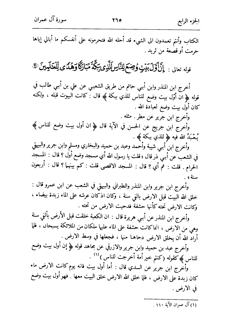 أخرج ابْن الْمُنْذر وَابْن أبي حَاتِم من طَرِيق الشّعبِيّ عَن عَليّ بن أبي طَالب فِي قَوْله {إِن أول بَيت وضع للنَّاس للَّذي ببكة} قَالَ: كَانَت الْبيُوت قبله وَلكنه كَانَ أول بَيت وضع لعبادة الله
