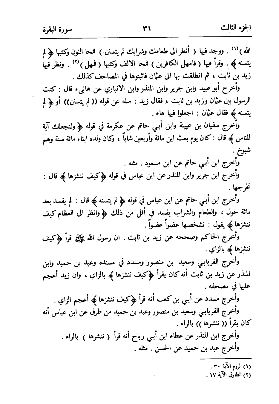 وَأخرج ابْن أبي حَاتِم عَن ابْن عَبَّاس فِي قَوْله {لم يتسنه} قَالَ: لم يفْسد بعد مائَة حول وَالطَّعَام وَالشرَاب يفْسد فِي أقل من ذَلِك {وَانْظُر إِلَى الْعِظَام كَيفَ ننشزها} يَقُول: نشخصها عضوا عضوا
