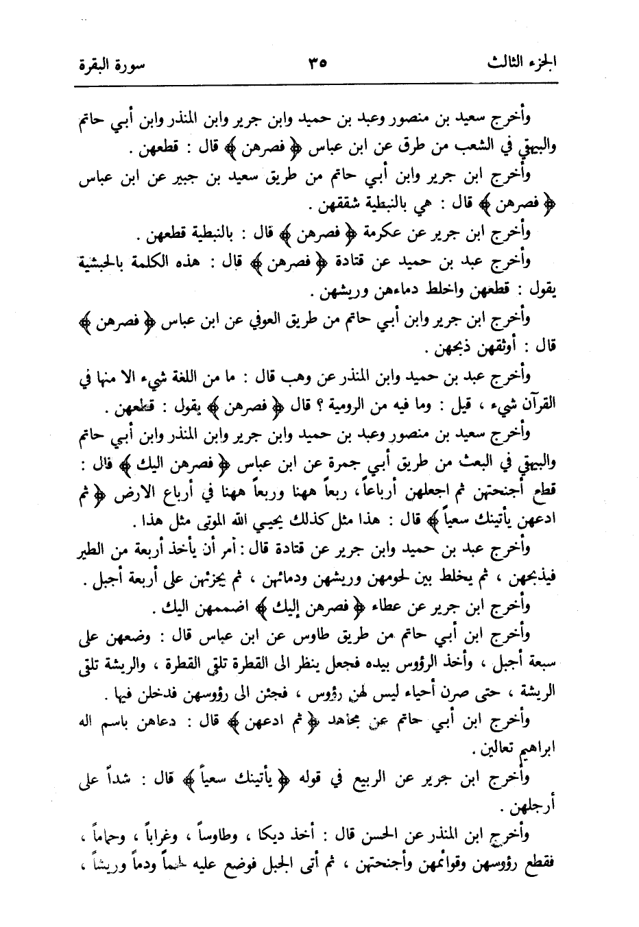 وَأخرج سعيد بن مَنْصُور وَعبد بن حميد وَابْن جرير وَابْن الْمُنْذر وَابْن أبي حَاتِم وَالْبَيْهَقِيّ فِي الْبَعْث من طَرِيق أبي جَمْرَة عَن ابْن عَبَّاس {فصرهن إِلَيْك} قَالَ: قطع أجنحتهن ثمَّ اجعلهن أَربَاعًا ربعا هَهُنَا وربعاً هَهُنَا فِي أَربَاع الأَرْض {ثمَّ ادعهن يأتينك سعياً} قَالَ: هَذَا مثل كَذَلِك يحيي الله الْمَوْتَى مثل هَذَا