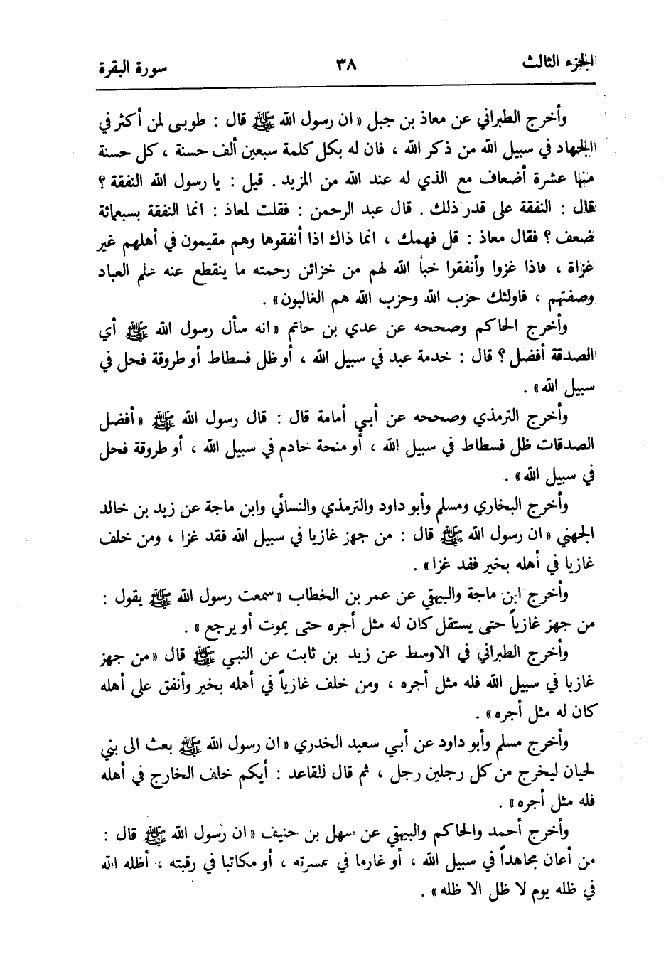 وَأخرج البُخَارِيّ وَمُسلم وَأَبُو دَاوُود وَالتِّرْمِذِيّ وَالنَّسَائِيّ وَابْن ماجة عَن زيد بن خَالِد الْجُهَنِيّ أَن رَسُول الله صلى الله عَلَيْهِ وَسلم قَالَ: من جهز غازياً فِي سَبِيل الله فقد غزا وَمن خلف غازياً فِي أَهله بِخَير فقد غزا