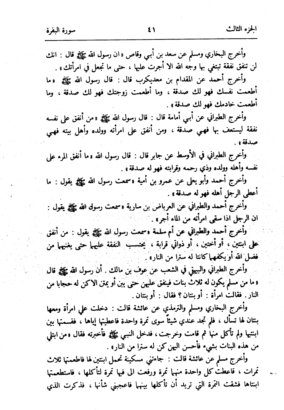 وَأخرج البُخَارِيّ وَمُسلم عَن سعد بن أبي وَقاص أَن رَسُول الله صلى الله عَلَيْهِ وَسلم قَالَ: إِنَّك لن تنْفق نَفَقَة تبتغي بهَا وَجه الله إِلَّا أجرت عَلَيْهَا حَتَّى مَا تجْعَل فِي امْرَأَتك