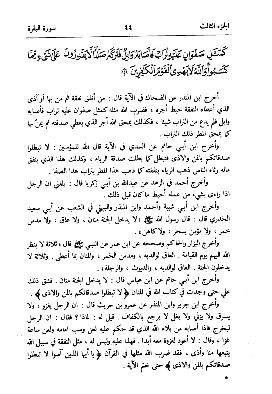 أخرج ابْن الْمُنْذر عَن الضَّحَّاك فِي الْآيَة قَالَ: من أنْفق نَفَقَة ثمَّ منَّ بهَا أَو آذَى الَّذِي أعطَاهُ النَّفَقَة حَبط أجره فَضرب الله مثله كَمثل صَفْوَان عَلَيْهِ تُرَاب فَأَصَابَهُ وابل فَلم يدع من التُّرَاب شَيْئا فَكَذَلِك يمحق الله أجر الَّذِي يُعْطي صدقته ثمَّ يمنّ بهَا كَمَا يمحق الْمَطَر ذَلِك التُّرَاب