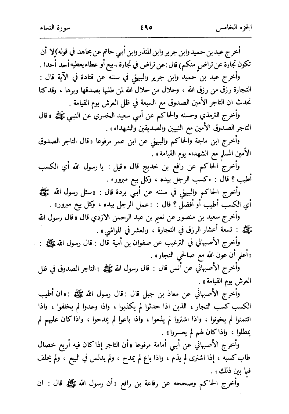 وَأخرج التِّرْمِذِيّ وَحسنه الْحَاكِم عَن أبي سعيد الْخُدْرِيّ عَن النَّبِي صلى الله عَلَيْهِ وَسلم قَالَ: التَّاجِر الصدوق الْأمين مَعَ النَّبِيين وَالصديقين وَالشُّهَدَاء