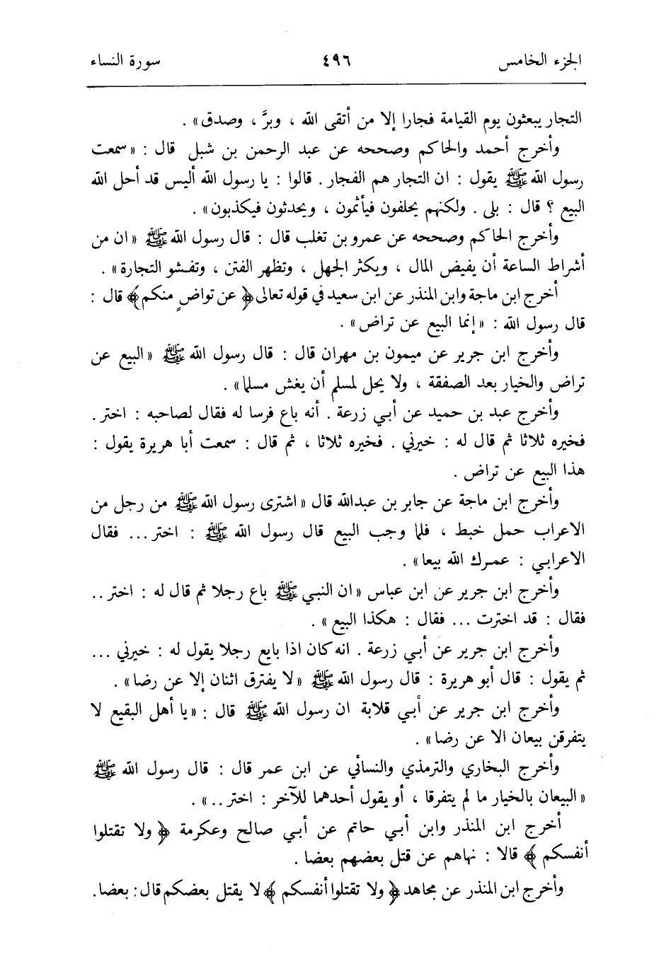 أخرج ابْن مَاجَه وَابْن الْمُنْذر عَن ابْن سعيد فِي قَوْله تَعَالَى {عَن تراضٍ مِنْكُم} قَالَ: قَالَ رَسُول الله: إِنَّمَا البيع عَن ترَاض