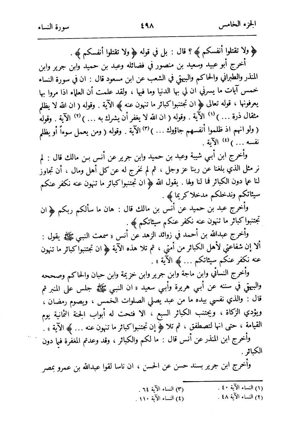 أخرج أَبُو عبيد وَسَعِيد بن مَنْصُور فِي فضائله وَعبد بن حميد وَابْن جرير وَابْن الْمُنْذر وَالطَّبَرَانِيّ وَالْحَاكِم وَالْبَيْهَقِيّ فِي الشّعب عَن ابْن مَسْعُود قَالَ: إِن فِي سُورَة النِّسَاء خمس آيَات مَا يسرني أَن لي بهَا الدُّنْيَا وَمَا فِيهَا وَلَقَد علمت أَن الْعلمَاء إِذا مروا بهَا يعرفونها قَوْله تَعَالَى {إِن تجتنبوا كَبَائِر مَا تنهون عَنهُ} الْآيَة
