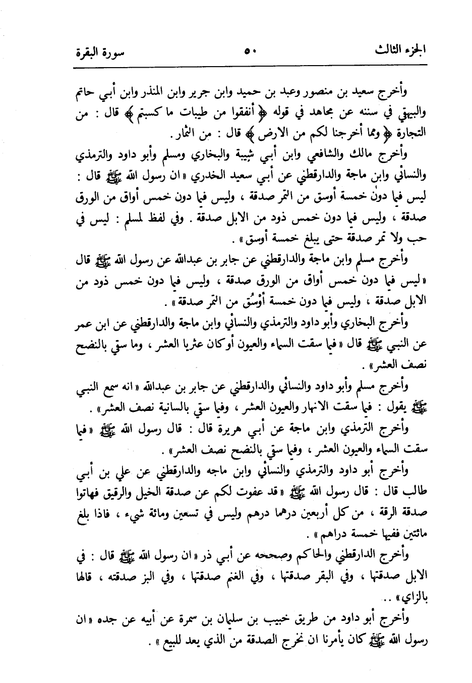 وَأخرج مَالك وَالشَّافِعِيّ وَابْن أبي شيبَة وَالْبُخَارِيّ وَمُسلم وَأَبُو دَاوُد وَالتِّرْمِذِيّ وَالنَّسَائِيّ وَابْن مَاجَه وَالدَّارَقُطْنِيّ عَن أبي سعيد الْخُدْرِيّ أَن رَسُول الله صلى الله عَلَيْهِ وَسلم قَالَ: لَيْسَ فِيمَا دون خَمْسَة أوسق من التَّمْر صَدَقَة وَلَيْسَ فِيمَا دون خمس أَوَاقٍ من الْوَرق صَدَقَة وَلَيْسَ فِيمَا دون خمس ذود من الْإِبِل صَدَقَة