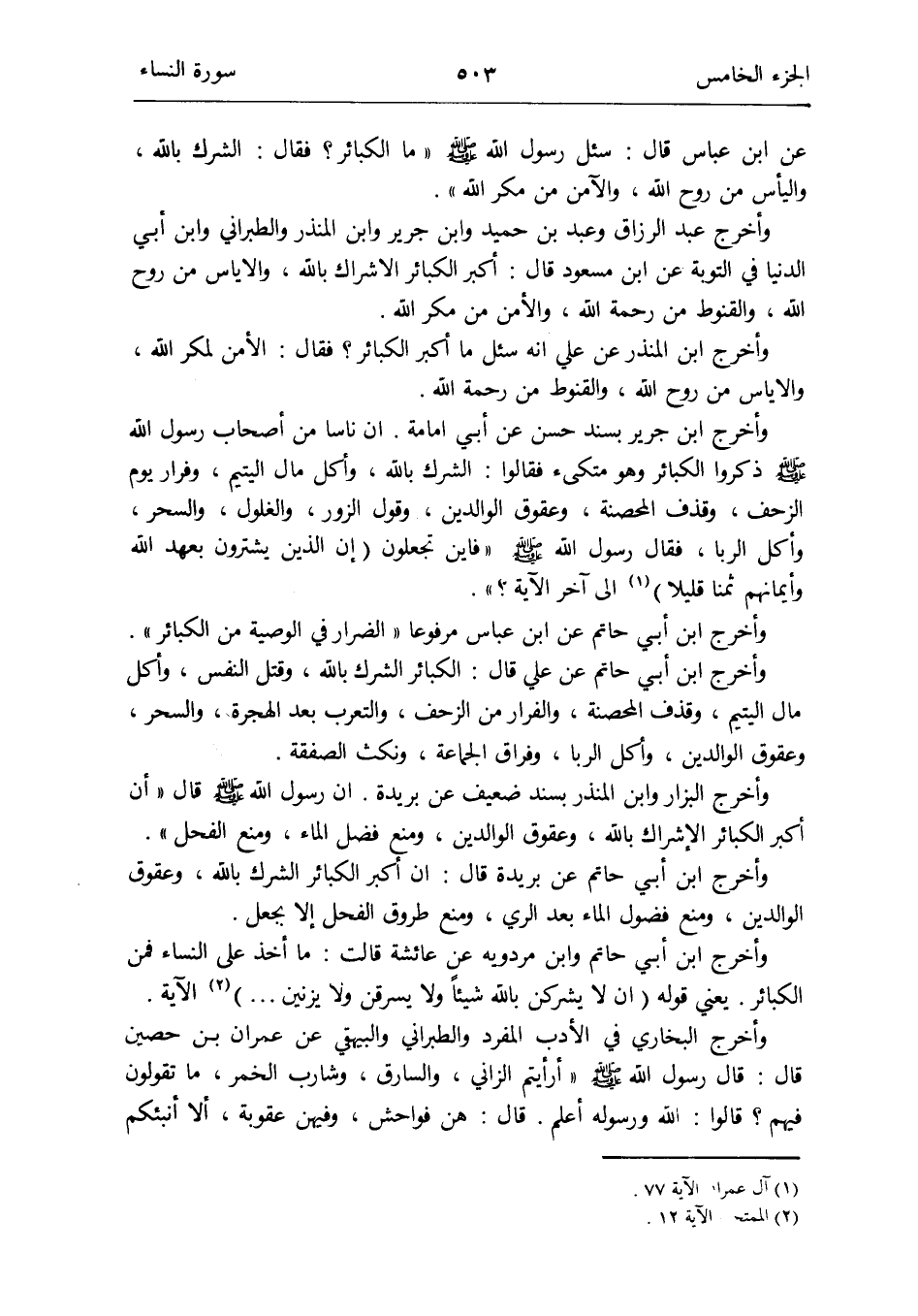 وَأخرج ابْن جرير بِسَنَد حسن عَن أبي أُمَامَة أَن نَاسا من أَصْحَاب رَسُول الله صلى الله عَلَيْهِ وَسلم ذكرُوا الْكَبَائِر وَهُوَ متكىء فَقَالُوا: الشّرك بِاللَّه وَأكل مَال الْيَتِيم وفرار يَوْم الزَّحْف وَقذف المحصنة وعقوق الْوَالِدين وَقَول الزُّور والغلول وَالسحر وَأكل الرِّبَا فَقَالَ رَسُول الله صلى الله عَلَيْهِ وَسلم: فَأَيْنَ تَجْعَلُونَ (إِن الَّذين يشْتَرونَ بِعَهْد الله وَأَيْمَانهمْ ثمنا قَلِيلا) (آل عمرَان الْآيَة 77) إِلَى آخر الْآيَة