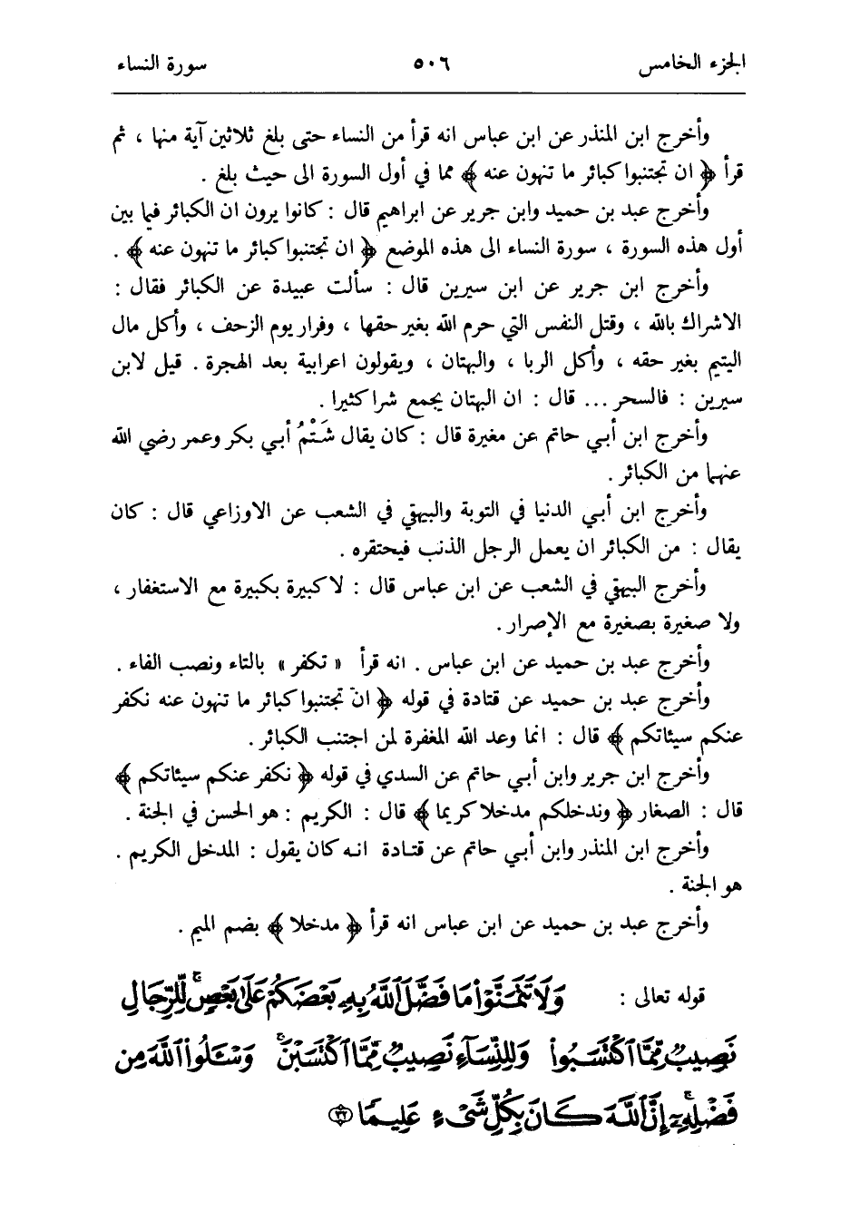 وَأخرج ابْن الْمُنْذر عَن ابْن عَبَّاس أَنه قَرَأَ من النِّسَاء حَتَّى بلغ ثَلَاثِينَ آيَة مِنْهَا ثمَّ قَرَأَ {إِن تجتنبوا كَبَائِر مَا تنهون عَنهُ} مِمَّا فِي أول السُّورَة إِلَى حَيْثُ بلغ
