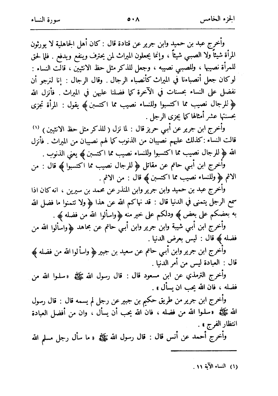 وَأخرج ابْن جرير عَن أبي حريز قَالَ: لما نزل (للذّكر مثل حَظّ الْأُنْثَيَيْنِ) (النِّسَاء الْآيَة 11) قَالَت النِّسَاء: كَذَلِك عَلَيْهِم نصيبان من الذُّنُوب كَمَا لَهُم نصيبان من الْمِيرَاث