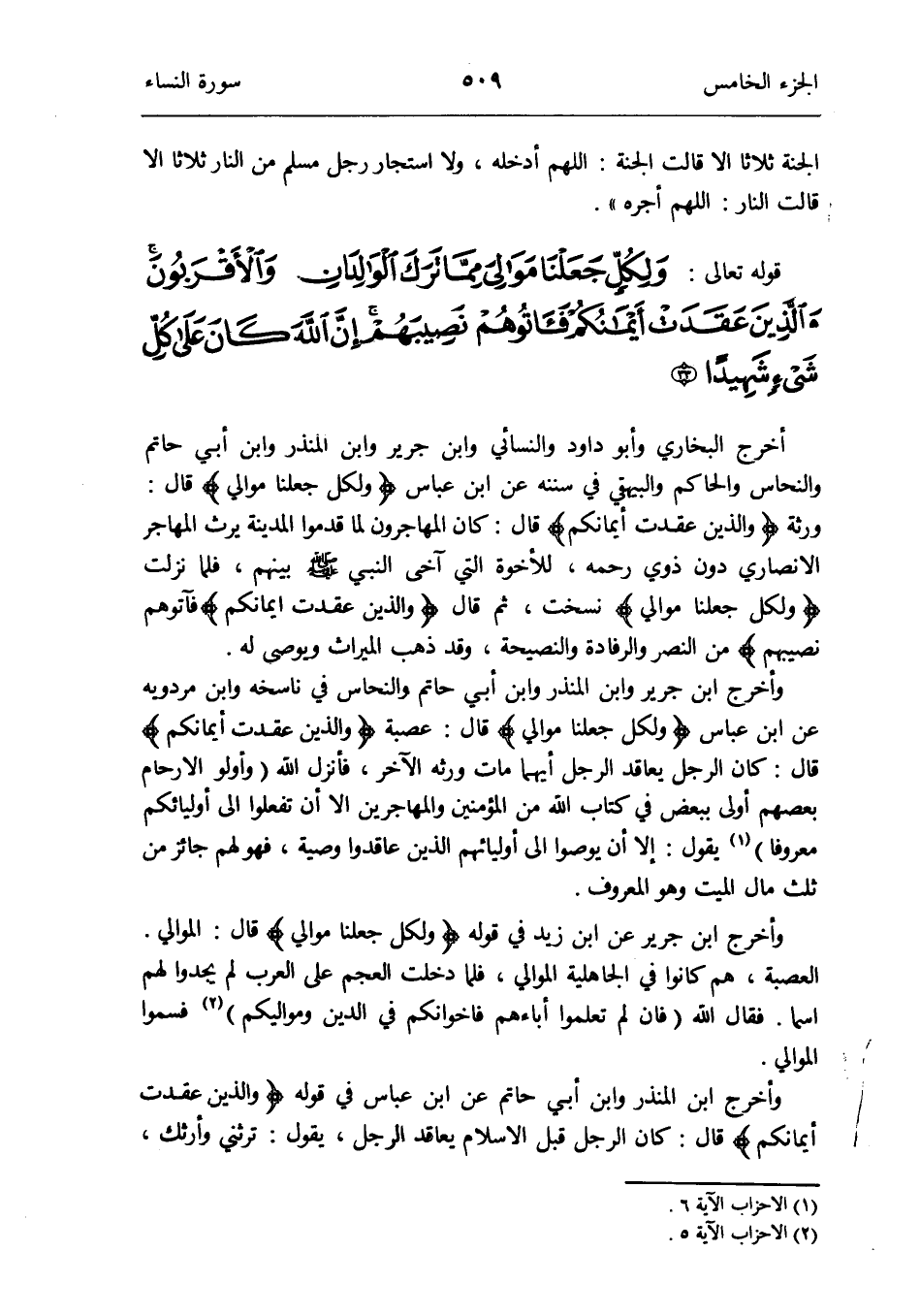 وَأخرج ابْن جرير وَابْن الْمُنْذر وَابْن أبي حَاتِم والنحاس فِي ناسخه وَابْن مرْدَوَيْه عَن ابْن عَبَّاس {وَلكُل جعلنَا موَالِي} قَالَ: عصبَة {وَالَّذين عقدت أَيْمَانكُم} قَالَ: كَانَ الرجل يعاقد الرجل أَيهمَا مَاتَ وَرثهُ الآخر فَأنْزل الله (وأولو الْأَرْحَام بَعضهم أولى بِبَعْض فِي كتاب الله من الْمُؤمنِينَ والمهاجرين إِلَّا أَن تَفعلُوا إِلَى أوليائكم مَعْرُوفا) (الْأَحْزَاب الْآيَة 6) يَقُول: إِلَّا أَن يوصوا إِلَى أَوْلِيَائِهِمْ الَّذين عقدوا وَصِيَّة فَهُوَ لَهُم جَائِز من ثلث مَال الْمَيِّت وَهُوَ الْمَعْرُوف