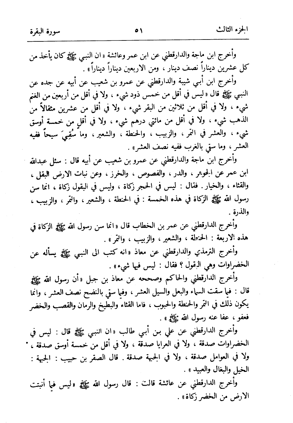 وَأخرج ابْن أبي شيبَة وَالدَّارَقُطْنِيّ عَن عَمْرو بن شُعَيْب عَن أَبِيه عَن جده عَن النَّبِي صلى الله عَلَيْهِ وَسلم قَالَ لَيْسَ فِي أقل من خمس ذود شَيْء وَلَا فِي أقل من أَرْبَعِينَ من الْغنم شَيْء وَلَا فِي أقل من ثَلَاثِينَ من الْبَقر شَيْء وَلَا فِي أقل من عشْرين مِثْقَالا من الذَّهَب شَيْء وَلَا فِي أقل من مِائَتي دِرْهَم شَيْء وَلَا فِي أقل من خَمْسَة أوسق شَيْء وَالْعشر فِي التَّمْر وَالزَّبِيب وَالْحِنْطَة وَالشعِير وَمَا سُقِيَ سيحاً فَفِيهِ الْعشْر وَمَا سقِِي بالغرب فَفِيهِ نصف الْعشْر