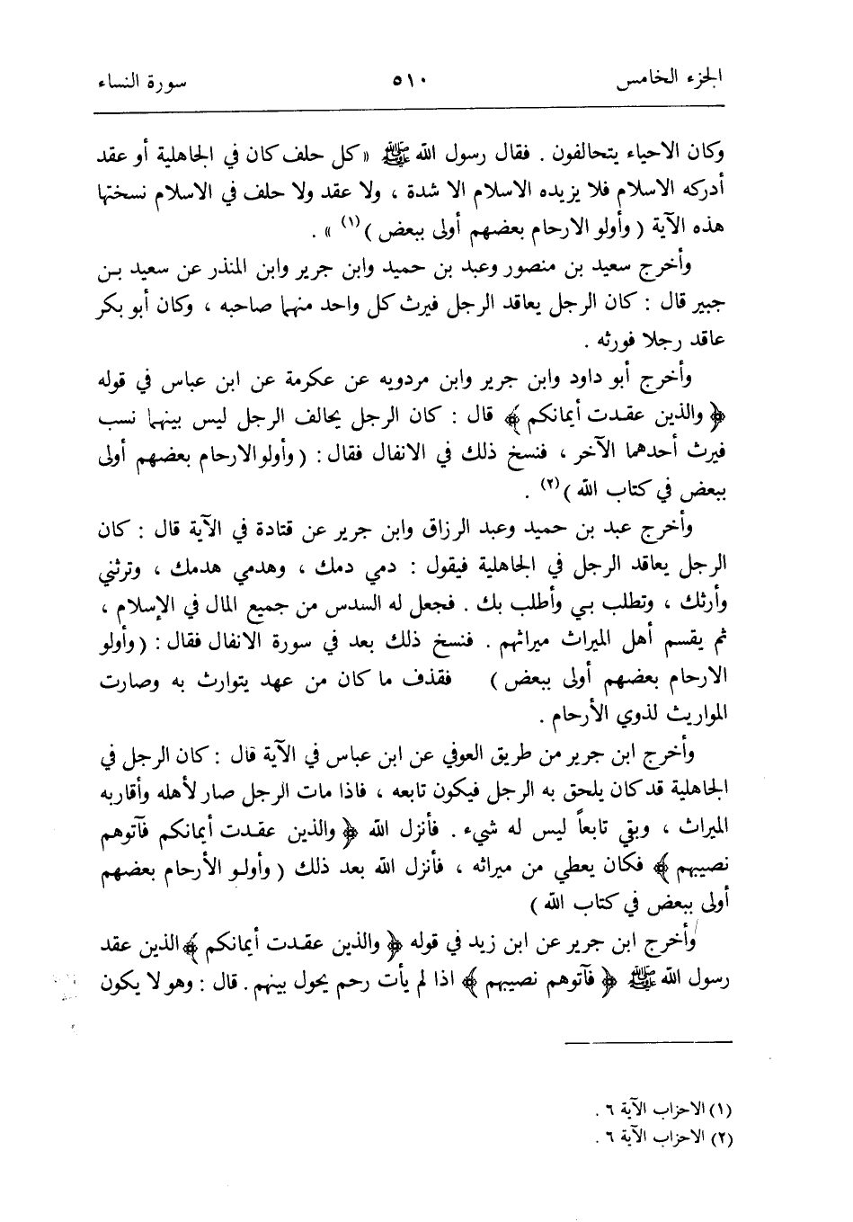 فَقَالَ رَسُول الله صلى الله عَلَيْهِ وَسلم: كل حلف كَانَ فِي الْجَاهِلِيَّة أَو عقد أدْركهُ الْإِسْلَام فَلَا يزِيدهُ الْإِسْلَام إِلَّا شدَّة وَلَا عقد وَلَا حلف فِي الْإِسْلَام نسختها هَذِه الْآيَة (وأولو الْأَرْحَام بَعضهم أولى بِبَعْض) (الْأَحْزَاب الْآيَة 6)