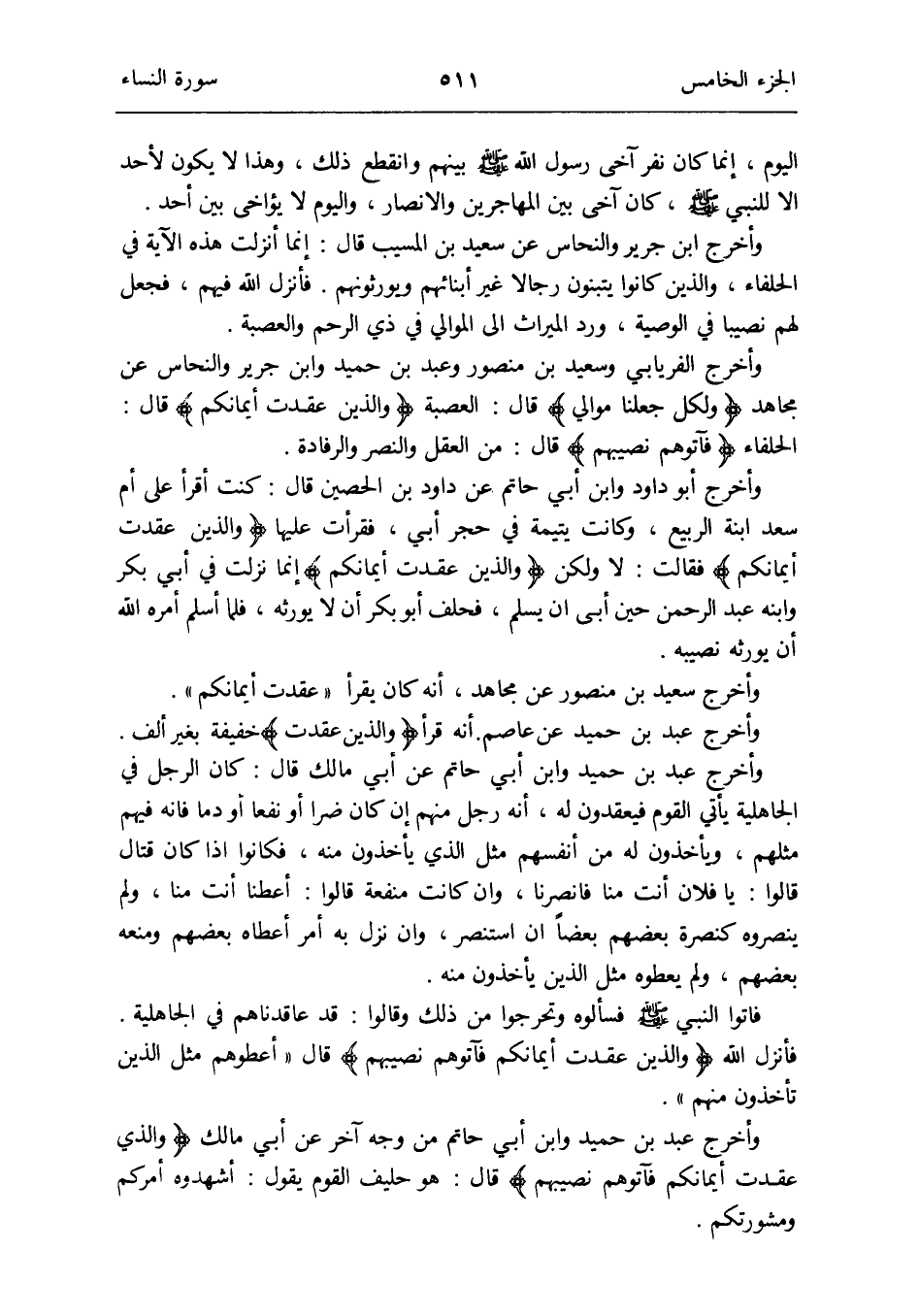 وَأخرج الْفرْيَابِيّ وَسَعِيد بن مَنْصُور وَعبد بن حميد وَابْن جرير والنحاس عَن مُجَاهِد {وَلكُل جعلنَا موَالِي} قَالَ: الْعصبَة {وَالَّذين عقدت أَيْمَانكُم} قَالَ: الحلفاء {فآتوهم نصِيبهم} قَالَ: من الْعقل والنصر والرفادة