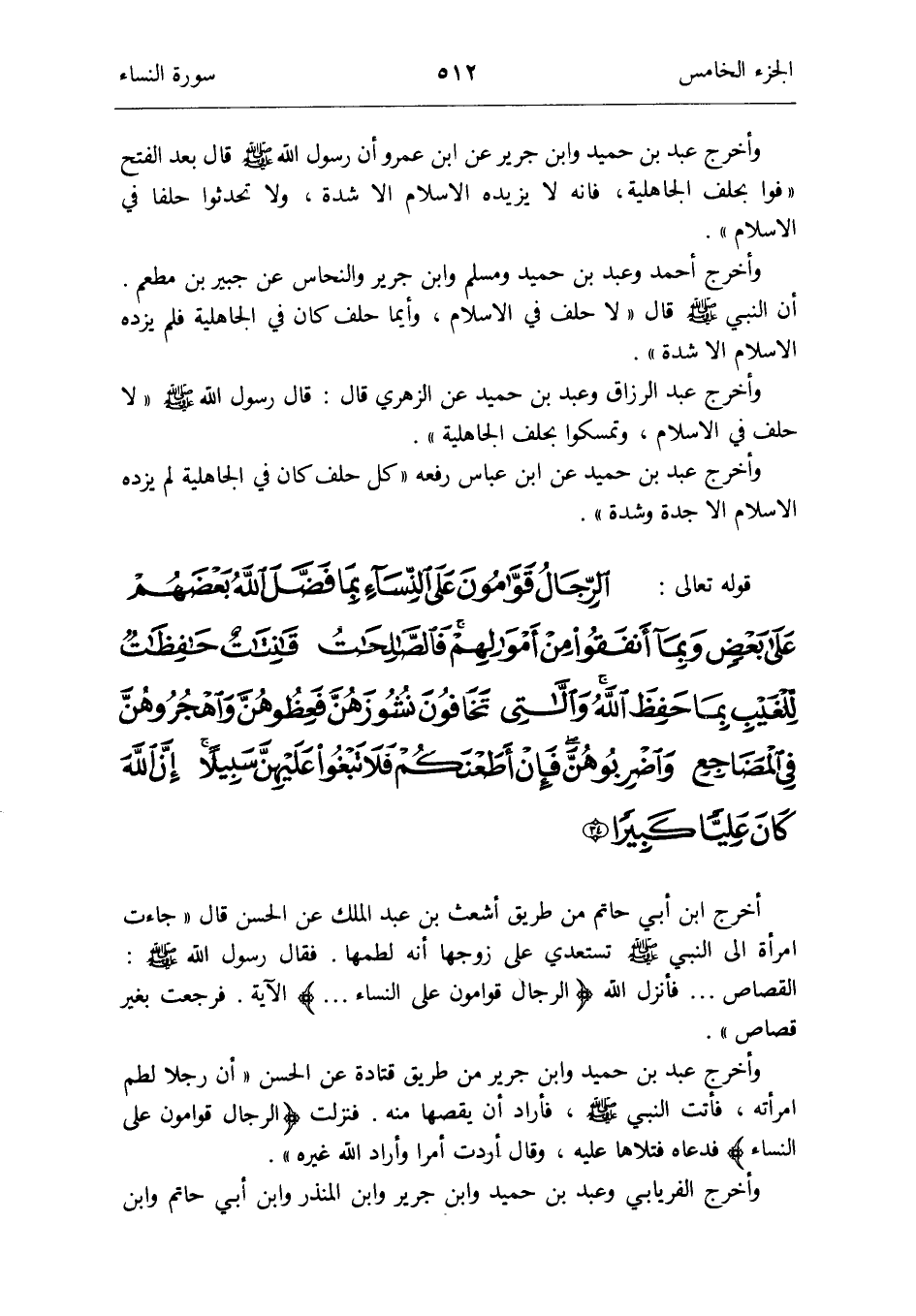 وَأخرج أَحْمد وَعبد بن حميد وَمُسلم وَابْن جرير والنحاس عَن جُبَير بن مطعم أَن النَّبِي صلى الله عَلَيْهِ وَسلم قَالَ: لَا حلف فِي الْإِسْلَام وَأَيّمَا حلف كَانَ فِي الْجَاهِلِيَّة فَلم يزده الْإِسْلَام إِلَّا شدَّة