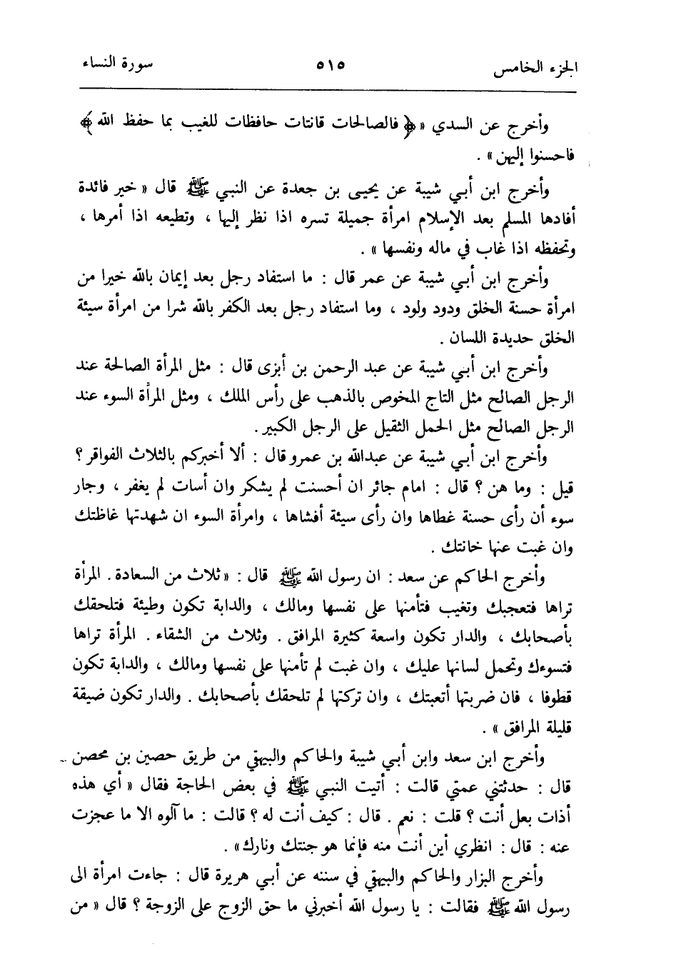 وَأخرج عَن السّديّ {فالصالحات قانتات حافظات للغيب بِمَا حفظ الله} فَأحْسنُوا إلَيْهِنَّ