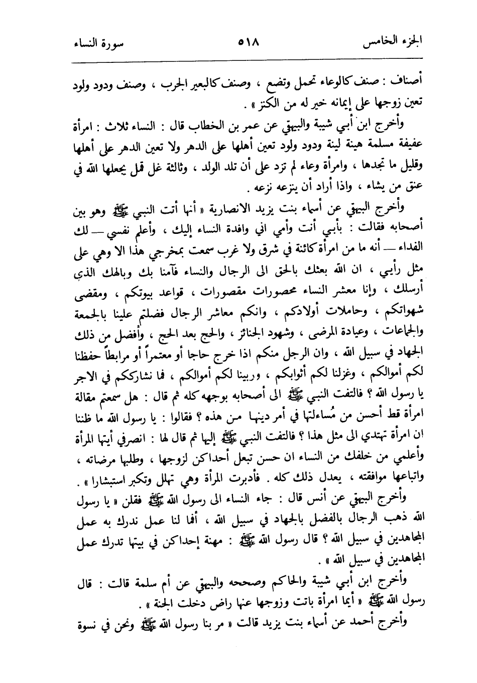وَأخرج الْبَيْهَقِيّ عَن أَسمَاء بنت يزِيد الْأَنْصَارِيَّة أَنَّهَا أَتَت النَّبِي صلى الله عَلَيْهِ وَسلم وَهُوَ بَين أَصْحَابه فَقَالَت: بِأبي أَنْت وَأمي إِنِّي وافدة النِّسَاء إِلَيْك وَأعلم نَفسِي - لَك الْفِدَاء - أَنه مَا من امْرَأَة كائنة فِي شَرق وَلَا غرب سَمِعت بمخرجي هَذَا إِلَّا وَهِي على مثل رَأْيِي إِن الله بَعثك بِالْحَقِّ إِلَى الرِّجَال وَالنِّسَاء فَآمَنا بك وبإلهك الَّذِي أرسلك وَإِنَّا معشر النِّسَاء محصورات مقصورات قَوَاعِد بُيُوتكُمْ ومقضى شهواتكم وحاملات أَوْلَادكُم وَإِنَّكُمْ معاشر الرِّجَال فضلْتُمْ علينا بِالْجمعَةِ وَالْجَمَاعَات وعيادة المرضى وشهود الْجَنَائِز وَالْحج بعد الْحَج وَأفضل من ذَلِك الْجِهَاد فِي سَبِيل الله وَإِن الرجل مِنْكُم إِذا خرج حَاجا أَو مُعْتَمِرًا أَو مرابطاً حفظنا لكم أَمْوَالكُم وغزلنا لكم أثوابكم وربينا لكم أَمْوَالكُم فَمَا نشارككم فِي الْأجر يَا رَسُول الله فَالْتَفت النَّبِي صلى الله عَلَيْهِ وَسلم إِلَى أَصْحَابه بِوَجْهِهِ كُله ثمَّ قَالَ: هَل سَمِعْتُمْ مقَالَة امْرَأَة قطّ أحسن من مسساءلتها فِي أَمر دينهَا من هَذِه فَقَالُوا يَا رَسُول الله مَا ظننا أَن امْرَأَة تهتدي إِلَى مثل هَذَا فَالْتَفت النَّبِي صلى الله عَلَيْهِ وَسلم إِلَيْهَا ثمَّ قَالَ لَهَا: انصرفي أيتها الْمَرْأَة وأعلمي من خَلفك من النِّسَاء إِن حسن تبعل إحداكن لزَوجهَا وطلبها مرضاته واتباعها مُوَافَقَته يعدل ذَلِك كُله