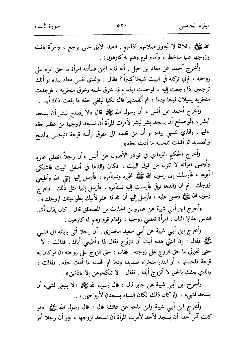 وَأخرج ابْن أبي شيبَة عَن جَابر قَالَ: قَالَ رَسُول الله صلى الله عَلَيْهِ وَسلم: لَا يَنْبَغِي لشَيْء أَن يسْجد لشَيْء وَلَو كَانَ ذَلِك لَكَانَ النِّسَاء يَسْجُدْنَ لِأَزْوَاجِهِنَّ