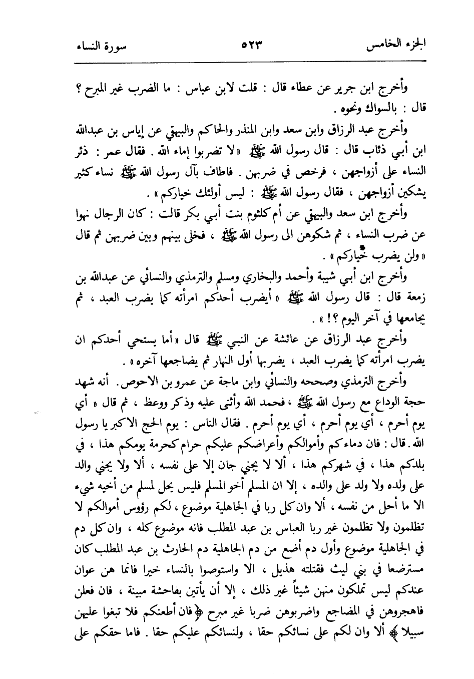 وَأخرج ابْن جرير عَن عَطاء قَالَ: قلت لِابْنِ عَبَّاس: مَا الضَّرْب غير المبرح قَالَ: بِالسِّوَاكِ وَنَحْوه