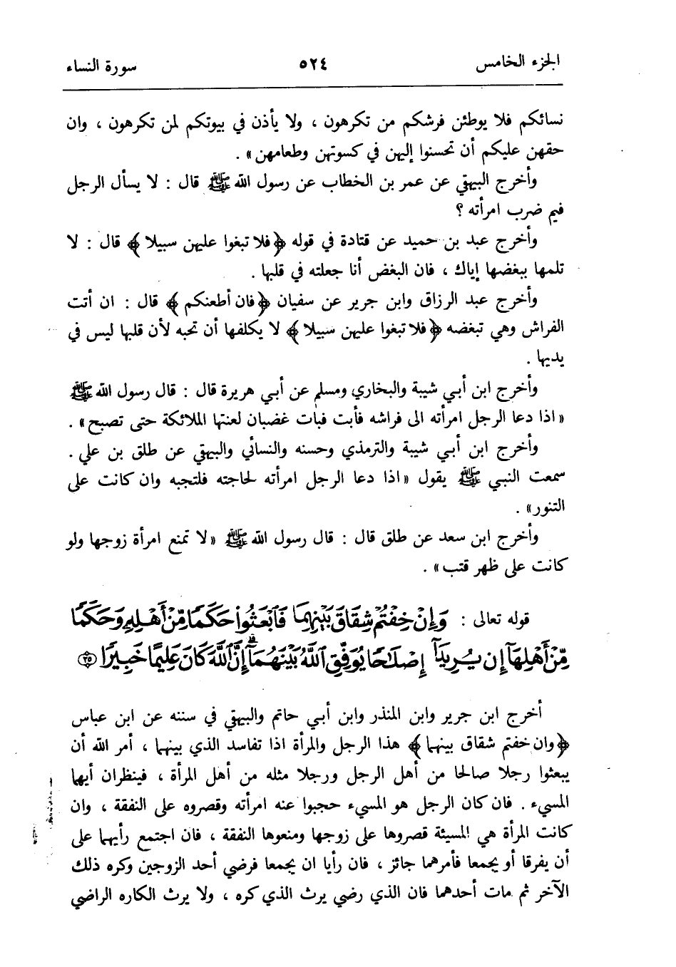 أخرج ابْن جرير وَابْن الْمُنْذر وَابْن أبي حَاتِم وَالْبَيْهَقِيّ فِي سنَنه عَن ابْن عَبَّاس {وَإِن خِفْتُمْ شقَاق بَينهمَا} هَذَا الرجل وَالْمَرْأَة إِذا تفاسد الَّذِي بَينهمَا أَمر الله أَن يبعثوا رجلا صَالحا من أهل الرجل ورجلاً مثله من أهل الْمَرْأَة فينظران أَيهمَا الْمُسِيء فَإِن كَانَ الرجل هُوَ الْمُسِيء حجبوا عَنهُ امْرَأَته وقصروه على النَّفَقَة وَإِن كَانَت الْمَرْأَة هِيَ المسيئة قصروها على زَوجهَا ومنعوها النَّفَقَة فَإِن اجْتمع رأيهما على أَن يفرقا أَو يجمعا فَأَمرهمَا جَائِز فَإِن رَأيا أَن يجمعا فَرضِي أحد الزَّوْجَيْنِ وَكره ذَلِك الآخر ثمَّ مَاتَ أَحدهمَا فَإِن الَّذِي رَضِي يَرث الَّذِي كره وَلَا يَرث الكاره الراضي
