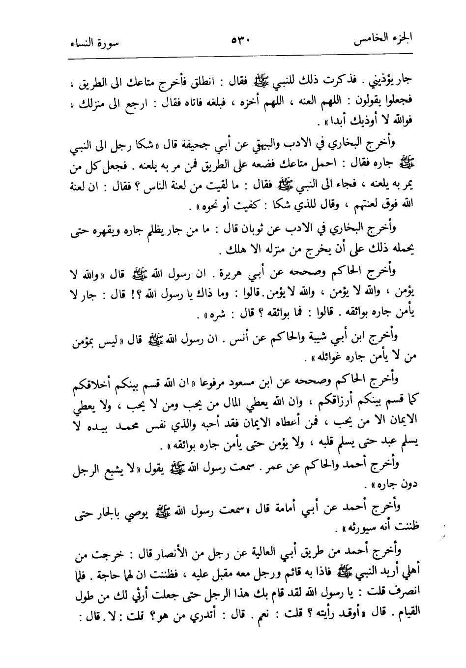 وَأخرج البُخَارِيّ فِي الْأَدَب وَالْبَيْهَقِيّ عَن أبي جُحَيْفَة قَالَ: شكا رجل إِلَى النَّبِي صلى الله عَلَيْهِ وَسلم جَاره فَقَالَ: احْمِلْ متاعك فضعه على الطَّرِيق فَمن مر بِهِ يلعنه