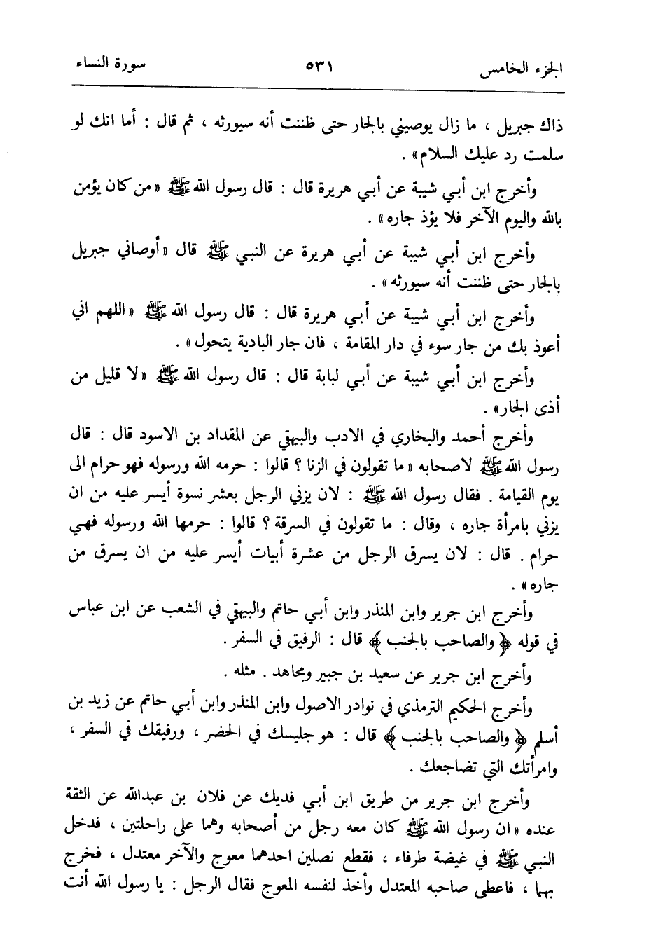 وَأخرج ابْن أبي شيبَة عَن أبي هُرَيْرَة عَن النَّبِي صلى الله عَلَيْهِ وَسلم قَالَ: أَوْصَانِي جِبْرِيل بالجار حَتَّى ظَنَنْت أَنه سيورثه