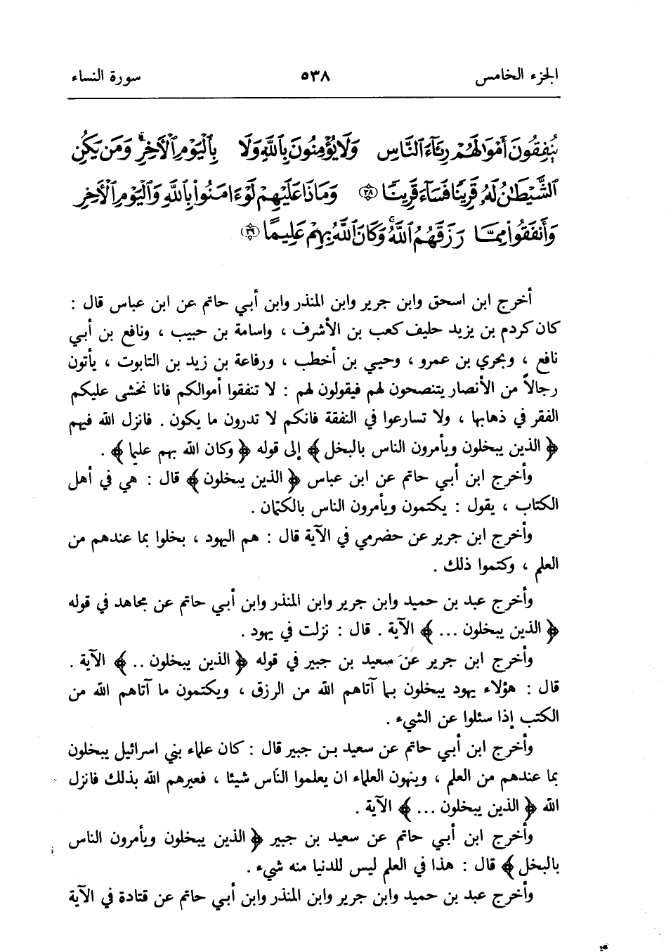 وَأخرج ابْن أبي حَاتِم عَن سعيد بن جُبَير {الَّذين يَبْخلُونَ ويأمرون النَّاس بالبخل} قَالَ: هَذَا فِي الْعلم لَيْسَ للدنيا مِنْهُ شَيْء