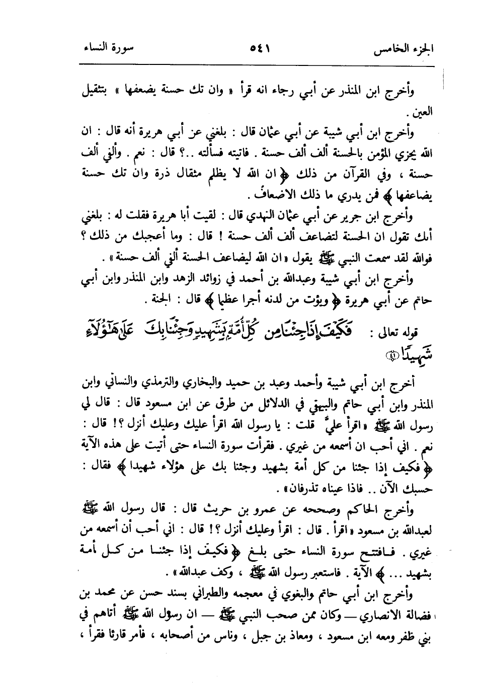 أخرج ابْن أبي شيبَة وَأحمد وَعبد بن حميد وَالْبُخَارِيّ وَالتِّرْمِذِيّ وَالنَّسَائِيّ وَابْن الْمُنْذر وَابْن أبي حَاتِم وَالْبَيْهَقِيّ فِي الدَّلَائِل من طرق ابْن مَسْعُود قَالَ: قَالَ لي رَسُول الله صلى الله عَلَيْهِ وَسلم: اقْرَأ عليَّ قلت: يَا رَسُول الله اقْرَأ عَلَيْك وَعَلَيْك أنزل قَالَ: نعم