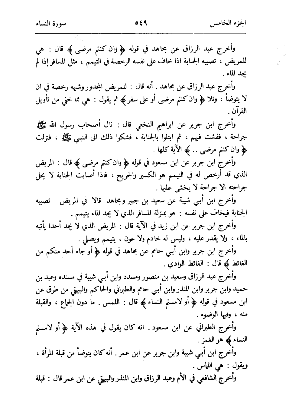 وَأخرج عبد الرَّزَّاق وَسَعِيد بن مَنْصُور ومسدد وَابْن أبي شيبَة فِي مُسْنده وَعبد بن حميد وَابْن جرير وَابْن الْمُنْذر وَابْن أبي حَاتِم وَالطَّبَرَانِيّ وَالْحَاكِم وَالْبَيْهَقِيّ من طرق عَن ابْن مَسْعُود فِي قَوْله {أَو لامستم النِّسَاء} قَالَ: اللَّمْس