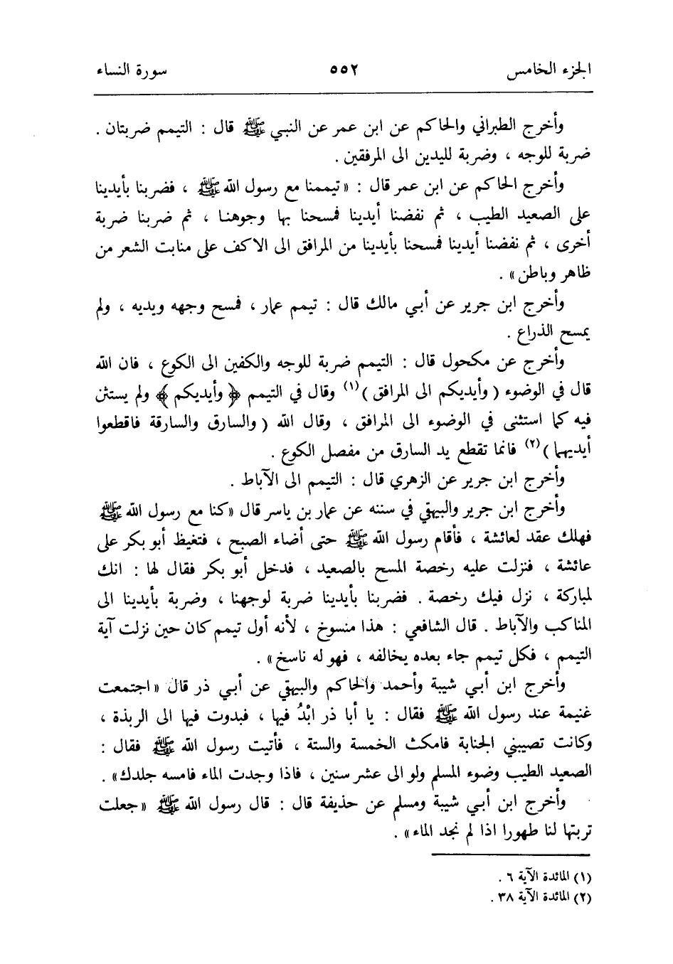 وَأخرج الطَّبَرَانِيّ وَالْحَاكِم عَن ابْن عمر عَن النَّبِي صلى الله عَلَيْهِ وَسلم قَالَ: التَّيَمُّم ضربتان: ضَرْبَة للْوَجْه وضربة لِلْيَدَيْنِ إِلَى الْمرْفقين