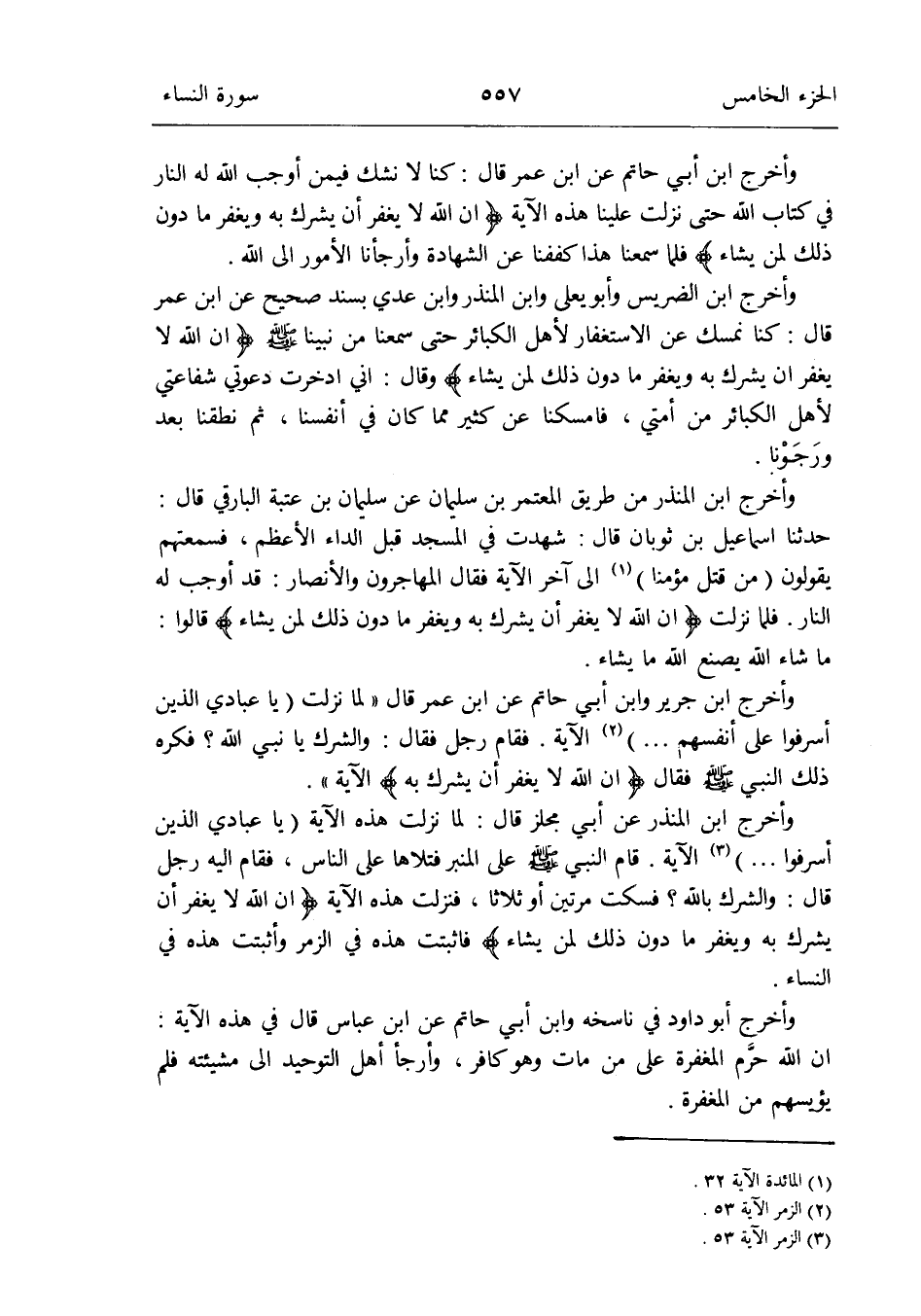 وَأخرج ابْن أبي حَاتِم عَن ابْن عمر قَالَ: كُنَّا لَا نشك فِيمَن أوجب الله لَهُ النَّار فِي كتاب الله حَتَّى نزلت علينا هَذِه الْآيَة {إِن الله لَا يغْفر أَن يُشْرك بِهِ وَيغْفر مَا دون ذَلِك لمن يَشَاء} فَلَمَّا سمعنَا هَذَا كففنا عَن الشَّهَادَة وأرجأنا الْأُمُور إِلَى الله