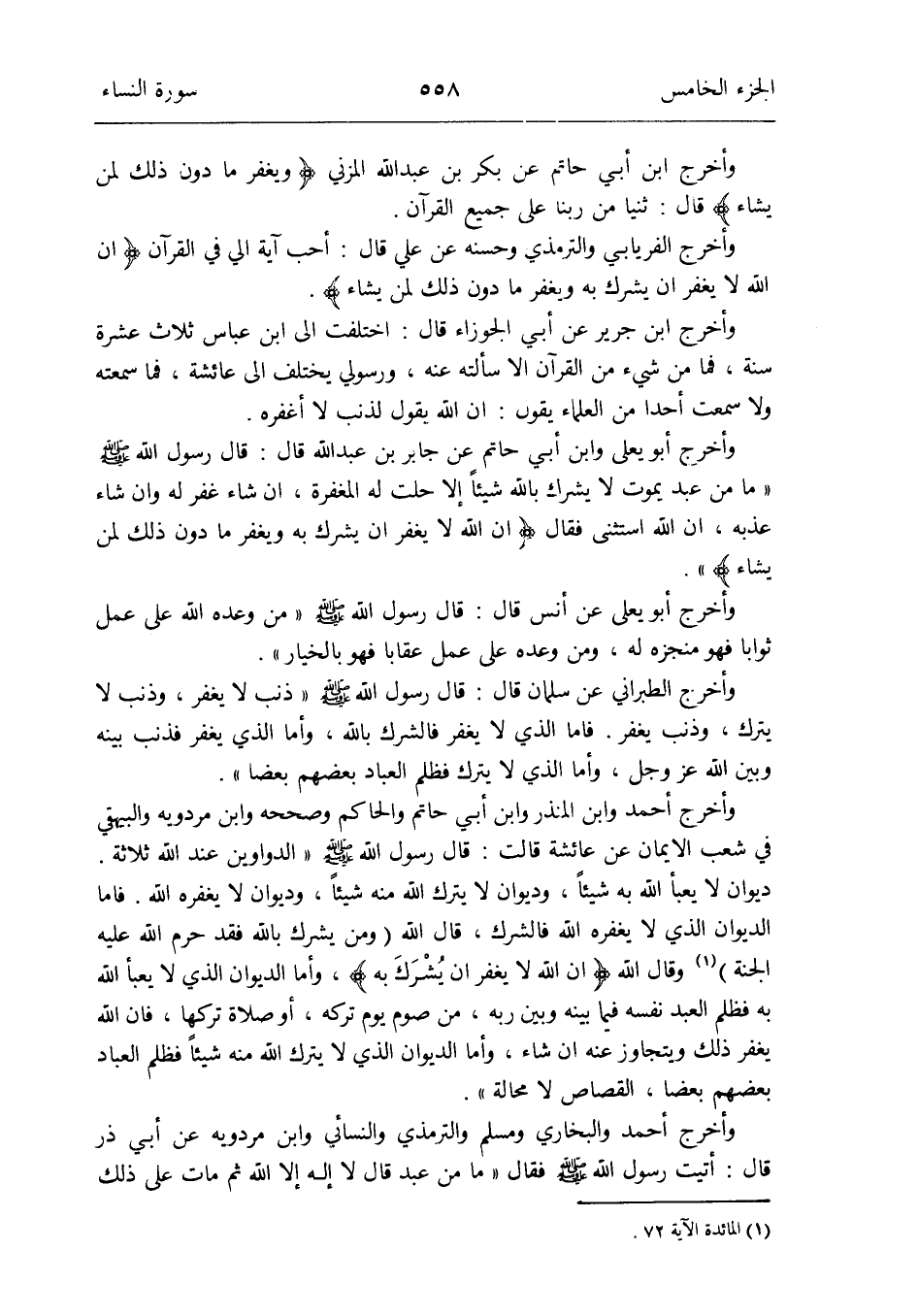 وَأخرج أَبُو يعلى وَابْن أبي حَاتِم عَن جَابر بن عبد الله قَالَ: قَالَ رَسُول الله صلى الله عَلَيْهِ وَسلم: مَا من عبد يَمُوت لَا يُشْرك بِاللَّه شَيْئا إِلَّا حلت لَهُ الْمَغْفِرَة إِن شَاءَ غفر لَهُ وَإِن شَاءَ عذبه إِن الله اسْتثْنى فَقَالَ {إِن الله لَا يغْفر أَن يُشْرك بِهِ وَيغْفر مَا دون ذَلِك لمن يَشَاء}