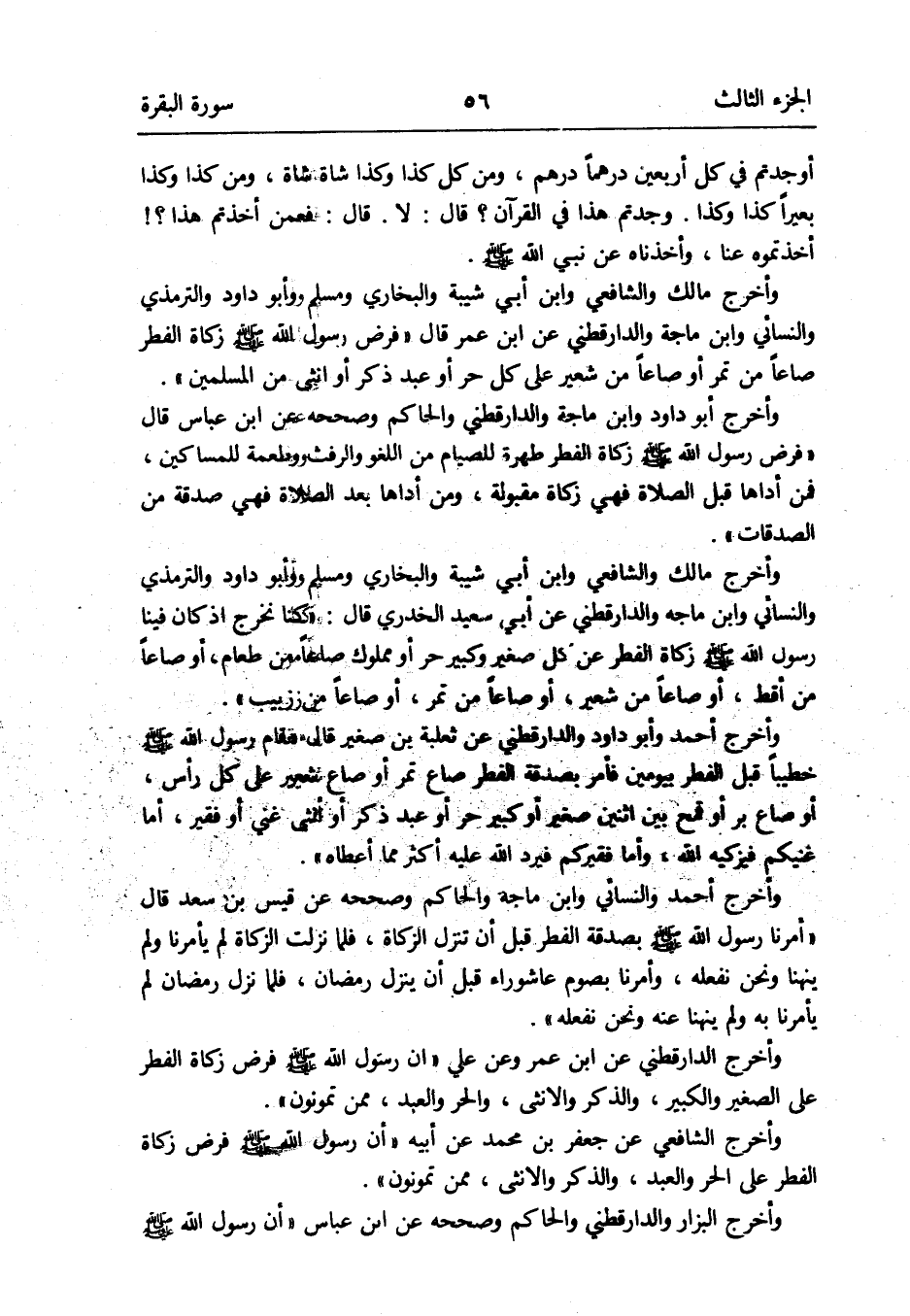 وَأخرج مَالك وَالشَّافِعِيّ وَابْن أبي شيبَة وَالْبُخَارِيّ وَمُسلم وَأَبُو دَاوُد وَالتِّرْمِذِيّ وَالنَّسَائِيّ وَابْن مَاجَه وَالدَّارَقُطْنِيّ عَن ابْن عمر قَالَ فرض رَسُول الله صلى الله عَلَيْهِ وَسلم زَكَاة الْفطر صَاعا من تمر أَو صَاعا من شعير على كل حر أَو عبد ذكر أَو انثى من الْمُسلمين