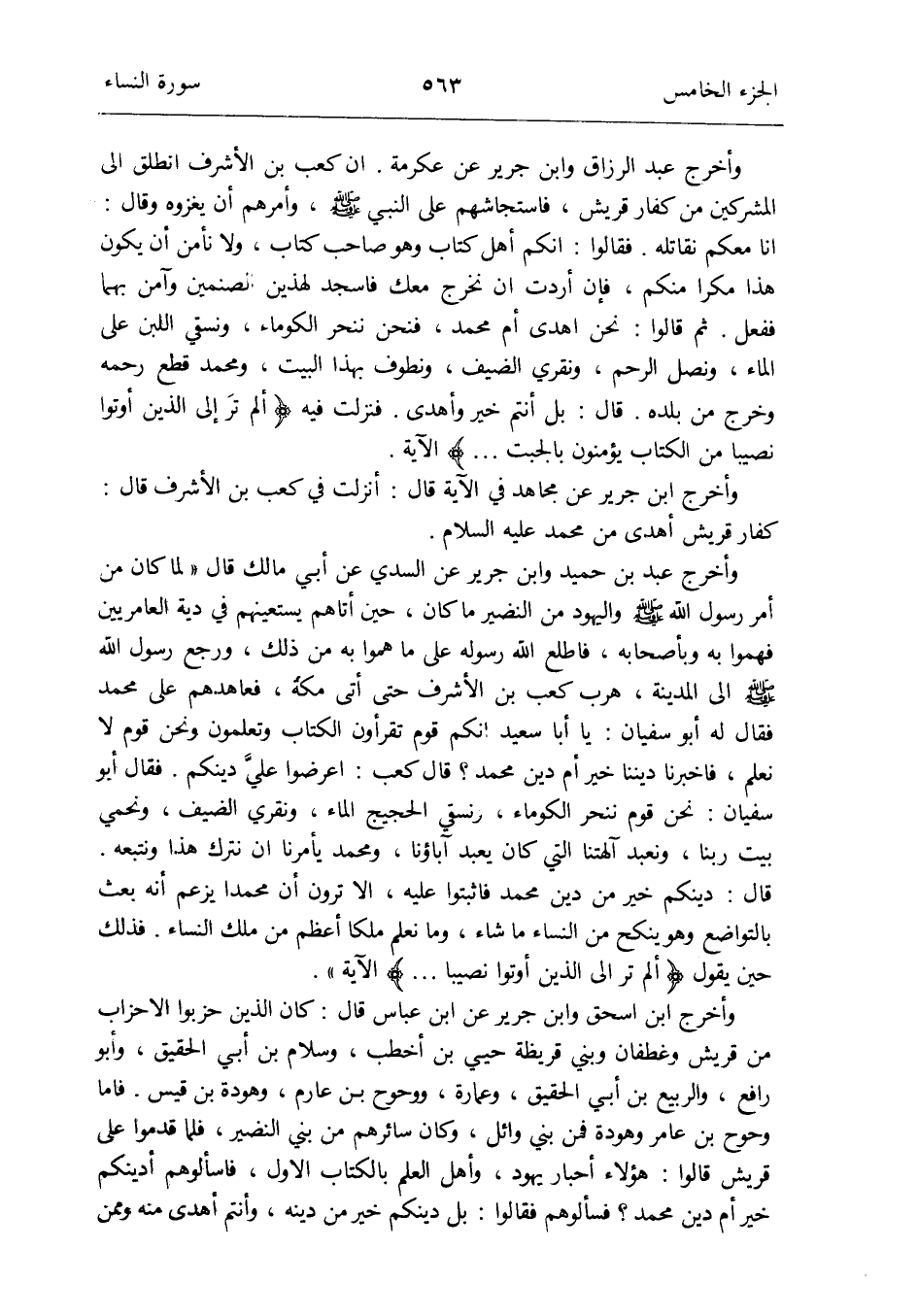 وَأخرج عبد بن حميد وَابْن جرير عَن السّديّ عَن أبي مَالك قَالَ: لما كَانَ من أَمر رَسُول الله صلى الله عَلَيْهِ وَسلم وَالْيَهُود من النَّضِير مَا كَانَ حِين أَتَاهُم يَسْتَعِينهُمْ فِي دِيَة الْعَامِرِيين فَهموا بِهِ وبأصحابه فَاطلع الله رَسُوله على مَا هموا بِهِ من ذَلِك وَرجع رَسُول الله صلى الله عَلَيْهِ وَسلم إِلَى الْمَدِينَة هرب كَعْب بن الْأَشْرَف حَتَّى أَتَى مَكَّة فعاهدهم على مُحَمَّد فَقَالَ لَهُ أَبُو سُفْيَان: يَا أَبَا سعيد إِنَّكُم قوم تقرأون الْكتاب وتعلمون وَنحن قوم لَا نعلم فاخبرنا ديننَا خير أم دين مُحَمَّد قَالَ كَعْب: اعرضوا عليَّ دينكُمْ