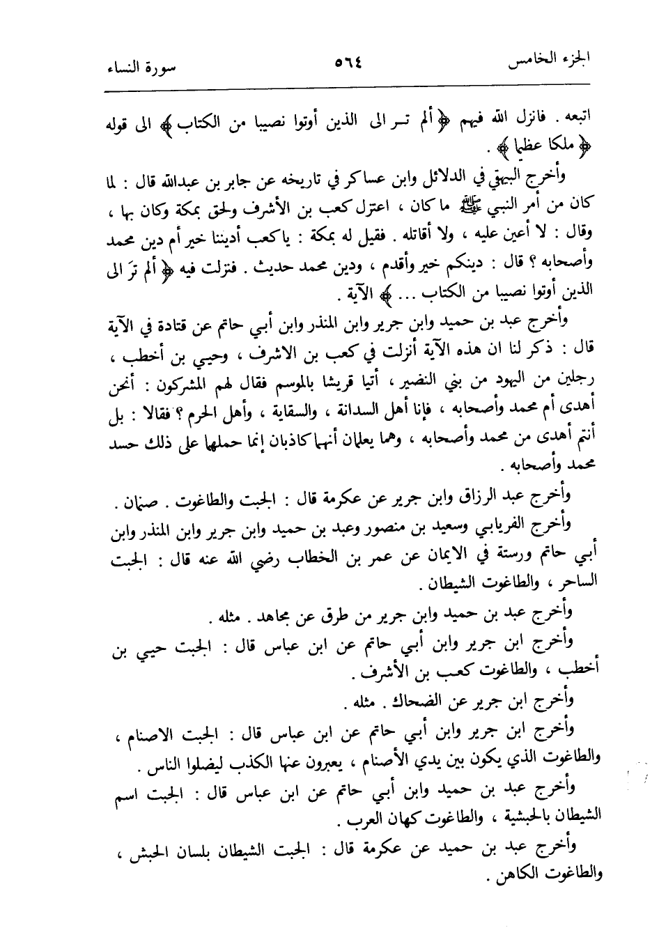 وَأخرج ابْن جرير وَابْن أبي حَاتِم عَن ابْن عَبَّاس قَالَ: الجبت الْأَصْنَام والطاغوت الَّذِي يكون بَين يَدي الْأَصْنَام يعبرون عَنْهَا الْكَذِب ليضلوا النَّاس