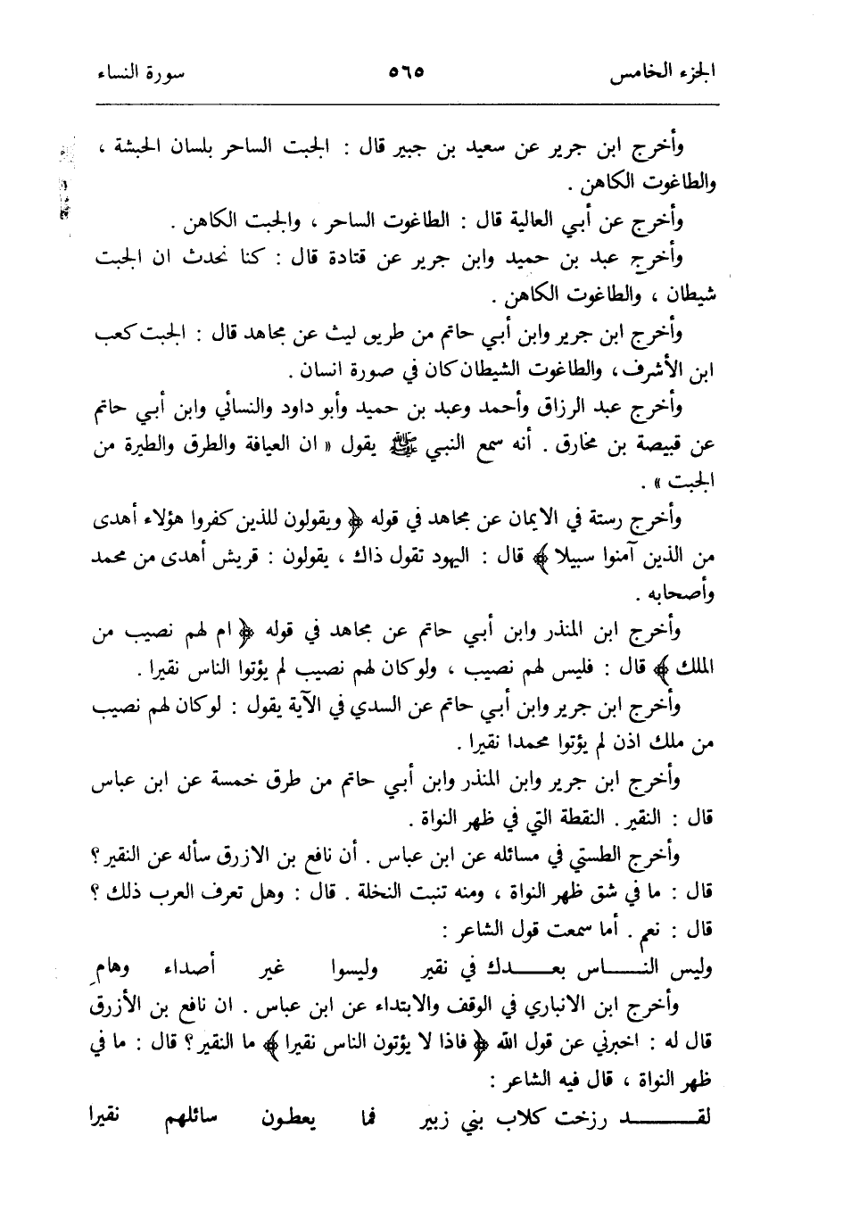 وَأخرج ابْن جرير وَابْن الْمُنْذر وَابْن أبي حَاتِم من طرق خَمْسَة عَن ابْن عَبَّاس قَالَ: النقير: النقطة الَّتِي فِي ظهر النواة