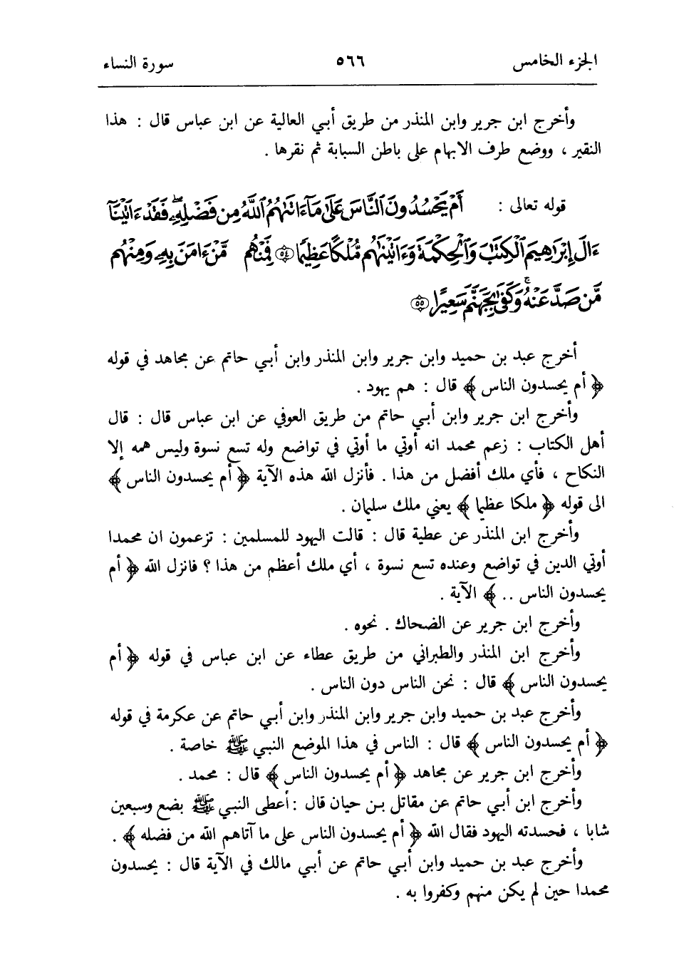 وَأخرج عبد بن حميد وَابْن جرير وَابْن الْمُنْذر وَابْن أبي حَاتِم عَن عِكْرِمَة فِي قَوْله {أم يحسدون النَّاس} قَالَ: النَّاس فِي هَذَا الْموضع النَّبِي صلى الله عَلَيْهِ وَسلم خَاصَّة
