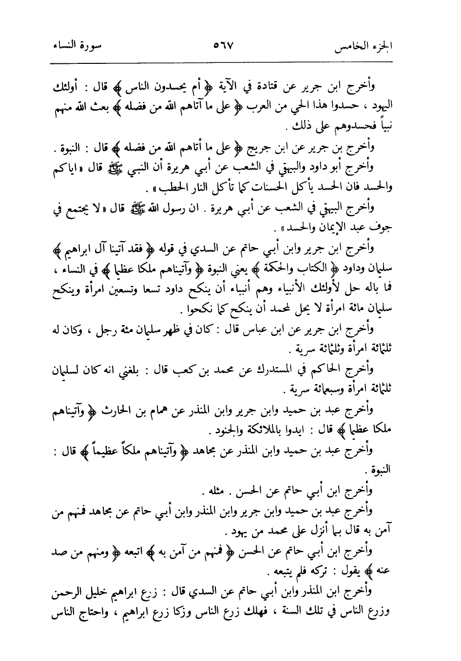 وَأخرج ابْن جرير عَن قَتَادَة فِي الْآيَة {أم يحسدون النَّاس} قَالَ: أُولَئِكَ الْيَهُود حسدوا هَذَا الْحَيّ من الْعَرَب {على مَا آتَاهُم الله من فَضله} بعث الله مِنْهُم نَبيا فحسدوهم على ذَلِك