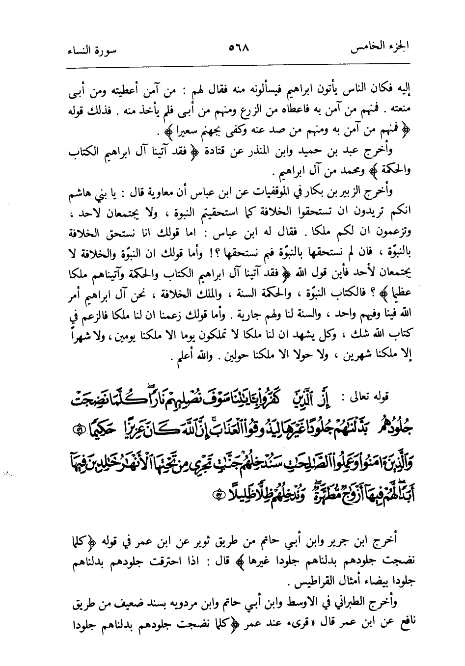 أخرج ابْن جرير وَابْن أبي حَاتِم من طَرِيق ثوبر عَن ابْن عمر فِي قَوْله {كلما نَضِجَتْ جُلُودهمْ بَدَّلْنَاهُمْ جُلُودًا غَيرهَا} قَالَ: إِذا احترقت جُلُودهمْ بَدَّلْنَاهُمْ جُلُودًا بَيْضَاء أَمْثَال الْقَرَاطِيس
