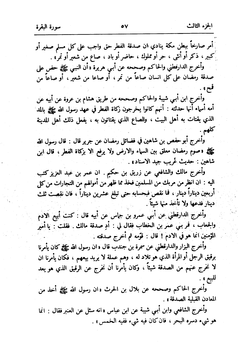 وَأخرج الدَّارَقُطْنِيّ وَالْحَاكِم وَصَححهُ عَن أبي هُرَيْرَة أَن النَّبِي صلى الله عَلَيْهِ وَسلم حض على صَدَقَة رَمَضَان على كل إِنْسَان صَاعا من تمر أَو صَاعا من شعير أَو صَاعا من قَمح