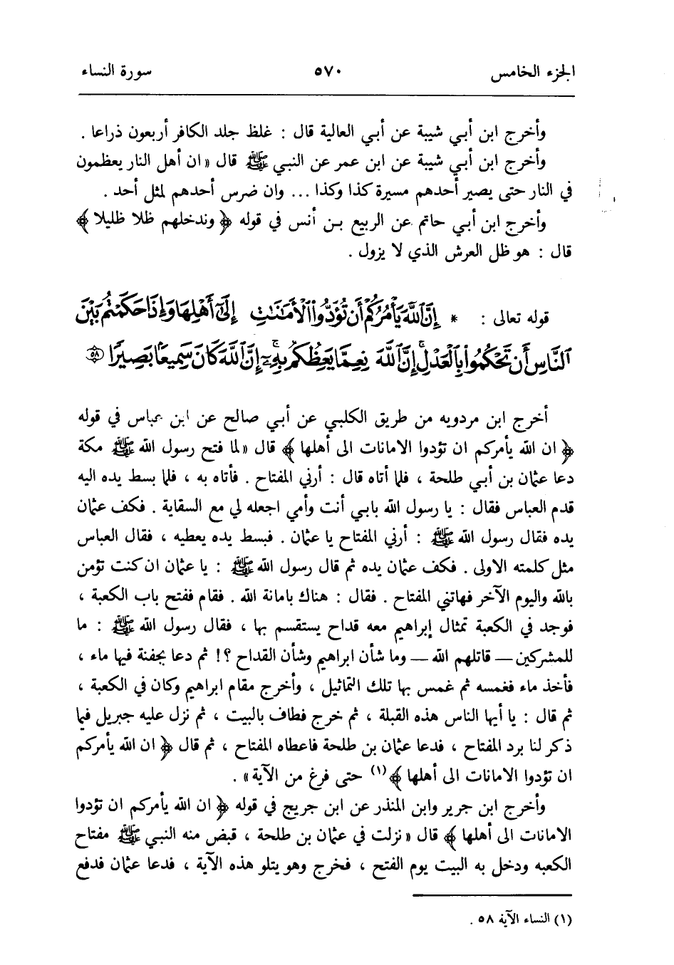 وَأخرج ابْن جرير وَابْن الْمُنْذر عَن ابْن جريج فِي قَوْله {إِن الله يَأْمُركُمْ أَن تُؤَدُّوا الْأَمَانَات إِلَى أَهلهَا} قَالَ: نزلت فِي عُثْمَان بن طَلْحَة قبض مِنْهُ النَّبِي صلى الله عَلَيْهِ وَسلم مِفْتَاح الْكَعْبَة وَدخل بِهِ الْبَيْت يَوْم الْفَتْح فَخرج وَهُوَ يَتْلُو هَذِه الْآيَة فَدَعَا عُثْمَان فَدفع