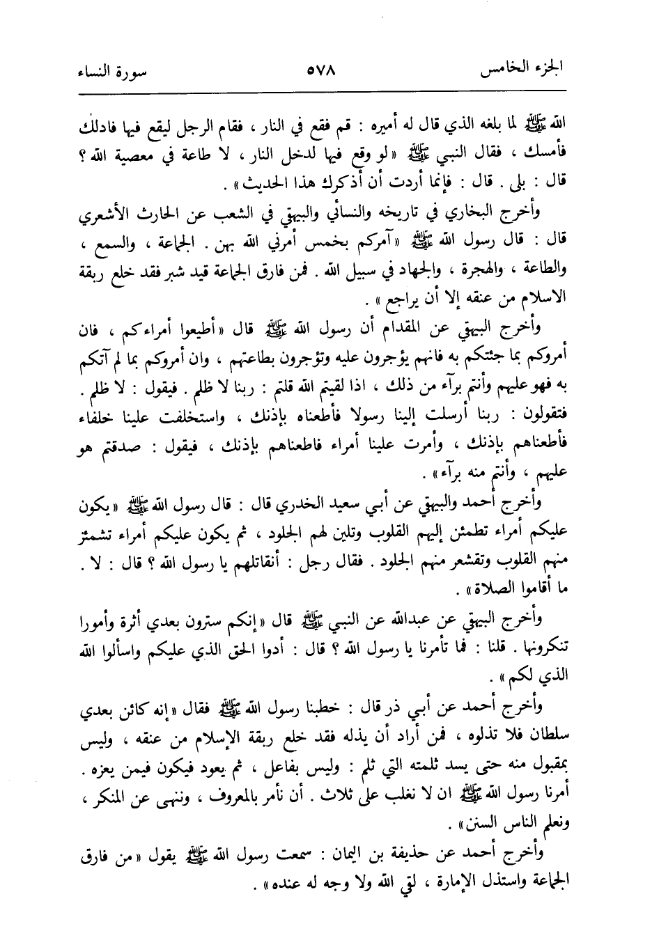 وَأخرج البُخَارِيّ فِي تَارِيخه وَالنَّسَائِيّ وَالْبَيْهَقِيّ فِي الشّعب عَن الْحَارِث الْأَشْعَرِيّ قَالَ: قَالَ رَسُول الله صلى الله عَلَيْهِ وَسلم: آمركُم بِخمْس أَمرنِي الله بِهن: الْجَمَاعَة والسمع وَالطَّاعَة وَالْهجْرَة وَالْجهَاد فِي سَبِيل الله