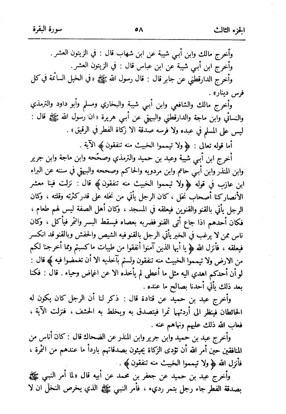 أخرج ابْن أبي شيبَة وَعبد بن حميد وَالتِّرْمِذِيّ وَصَححهُ وَابْن ماجة وَابْن جرير وَابْن الْمُنْذر وَابْن أبي حَاتِم وَابْن مرْدَوَيْه وَالْحَاكِم وَصَححهُ وَالْبَيْهَقِيّ فِي سنَنه عَن الْبَراء بن عَازِب فِي قَوْله {وَلَا تيمموا الْخَبيث مِنْهُ تنفقون} قَالَ: نزلت فِينَا معشر الْأَنْصَار كُنَّا أَصْحَاب نخل كَانَ الرجل يَأْتِي من نخله على قدر كثرته وقلته وَكَانَ الرجل يَأْتِي بالقنو والقنوين فيعلقه فِي الْمَسْجِد وَكَانَ أهل الصّفة لَيْسَ لَهُم طَعَام فَكَانَ أحدهم إِذا جَاع أَتَى القنو فَضَربهُ بعصاه فَيسْقط الْبُسْر وَالتَّمْر فيأكل وَكَانَ نَاس مِمَّن لَا يرغب فِي الْخَيْر يَأْتِي الرجل بالقنو فِيهِ الشيص والحفش وبالقنو قد انْكَسَرَ فيعلقه فَأنْزل الله {يَا أَيهَا الَّذين آمنُوا أَنْفقُوا من طَيّبَات مَا كسبتم وَمِمَّا أخرجنَا لكم من الأَرْض وَلَا تيمموا الْخَبيث مِنْهُ تنفقون ولستم بآخذيه إِلَّا أَن تغمضوا فِيهِ} قَالَ: لَو أَن أحدكُم اهدي إِلَيْهِ مثل مَا أعْطى لم يَأْخُذهُ إِلَّا عَن اغماض وحياء