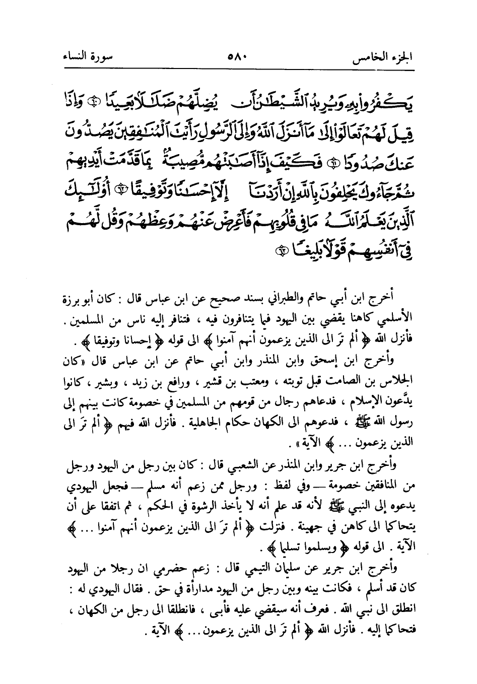 وَأخرج ابْن جرير وَابْن الْمُنْذر عَن الشّعبِيّ قَالَ: كَانَ بَين رجل من الْيَهُود وَرجل من الْمُنَافِقين خُصُومَة - وَفِي لفظ: وَرجل مِمَّن زعم أَنه مُسلم - فَجعل الْيَهُودِيّ يَدعُوهُ إِلَى النَّبِي صلى الله عَلَيْهِ وَسلم لِأَنَّهُ قد علم أَنه لَا يَأْخُذ الرِّشْوَة فِي الحكم ثمَّ اتفقَا على أَن يتحاكما إِلَى كَاهِن فِي جُهَيْنَة