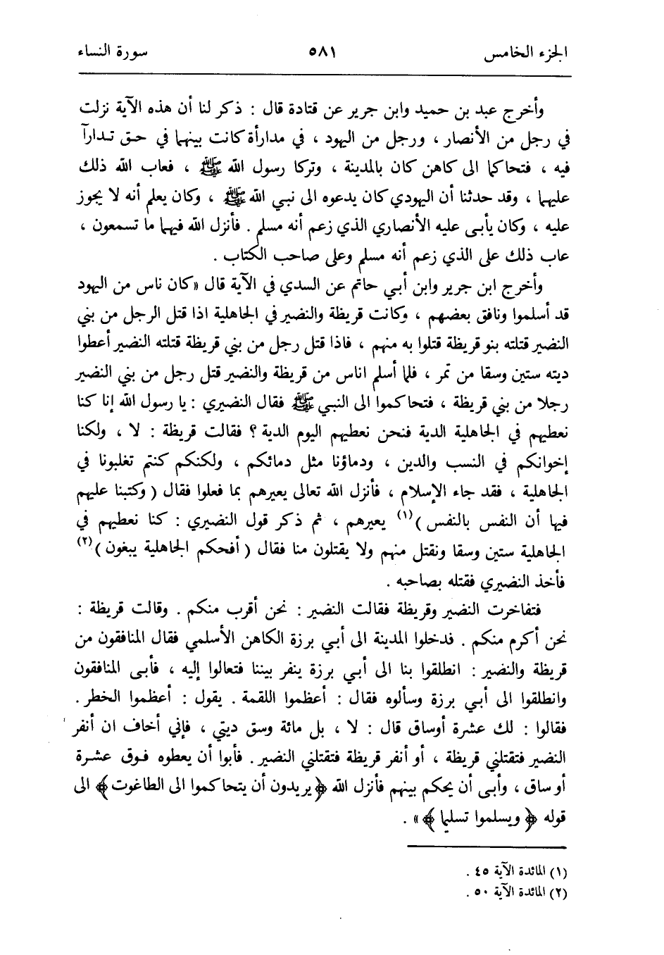 وَأخرج ابْن جرير وَابْن أبي حَاتِم عَن السّديّ فِي الْآيَة قَالَ: كَانَ نَاس من الْيَهُود قد أَسْلمُوا ونافق بَعضهم وَكَانَت قُرَيْظَة وَالنضير فِي الْجَاهِلِيَّة إِذا قتل الرجل من بني النَّضِير قتلته بَنو قُرَيْظَة قتلوا بِهِ مِنْهُم فَإِذا قتل رجل من بني قُرَيْظَة قتلته النَّضِير أعْطوا دِيَته سِتِّينَ وسْقا من تمر فَلَمَّا أسلم أنَاس من قُرَيْظَة وَالنضير قتل رجل من بني النَّضِير رجلا من بني قُرَيْظَة فَتَحَاكَمُوا إِلَى النَّبِي صلى الله عَلَيْهِ وَسلم فَقَالَ النضيري: يَا رَسُول الله إِنَّا كُنَّا نعطيهم فِي الْجَاهِلِيَّة الدِّيَة فَنحْن نعطيهم الْيَوْم الدِّيَة فَقَالَت قُرَيْظَة: لَا وَلَكنَّا إخْوَانكُمْ فِي النّسَب وَالدّين ودماؤنا مثل دمائكم وَلَكِنَّكُمْ كُنْتُم تغلبونا فِي الْجَاهِلِيَّة فقد جَاءَ الْإِسْلَام فَأنْزل الله تَعَالَى يعيرهم بِمَا فعلوا فَقَالَ (وكتبنا عَلَيْهِم فِيهَا أَن النَّفس بِالنَّفسِ) (الْمَائِدَة الْآيَة 45) يعيرهم ثمَّ ذكر قَول النضيري: كُنَّا نعطيهم فِي الْجَاهِلِيَّة سِتِّينَ وسْقا ونقتل مِنْهُم وَلَا يقتلُون منا فَقَالَ (أَفَحكم الْجَاهِلِيَّة يَبْغُونَ) (الْمَائِدَة الْآيَة 50) فَأخذ النضيري فَقتله بِصَاحِبِهِ
