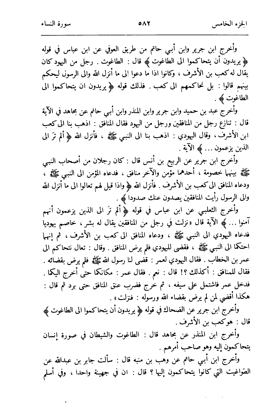 وَأخرج ابْن جرير وَابْن أبي حَاتِم من طَرِيق الْعَوْفِيّ عَن ابْن عَبَّاس فِي قَوْله {يُرِيدُونَ أَن يتحاكموا إِلَى الطاغوت} قَالَ: الطاغوت